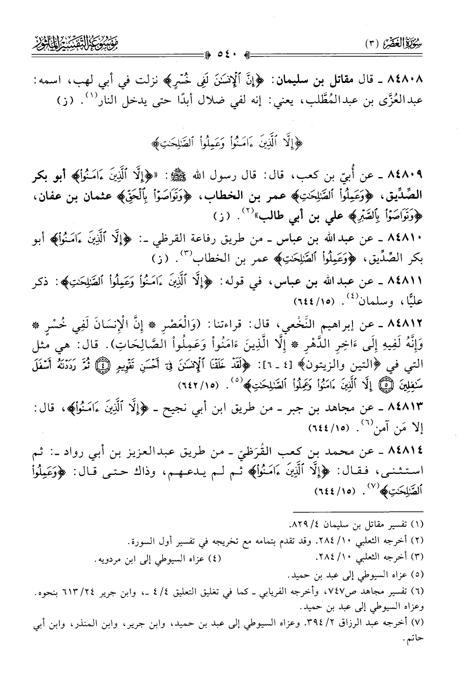 ٨٤٨٠٨ - قال مقاتل بن سليمان: {إنَّ الإنْسانَ لَفِي خُسْرٍ} نزلت في أبي لهب، اسمه: عبد العُزّى بن عبد المُطَّلب، يعني: إنه لفي ضلال أبدًا حتى يدخل النار (¬١). (ز)
