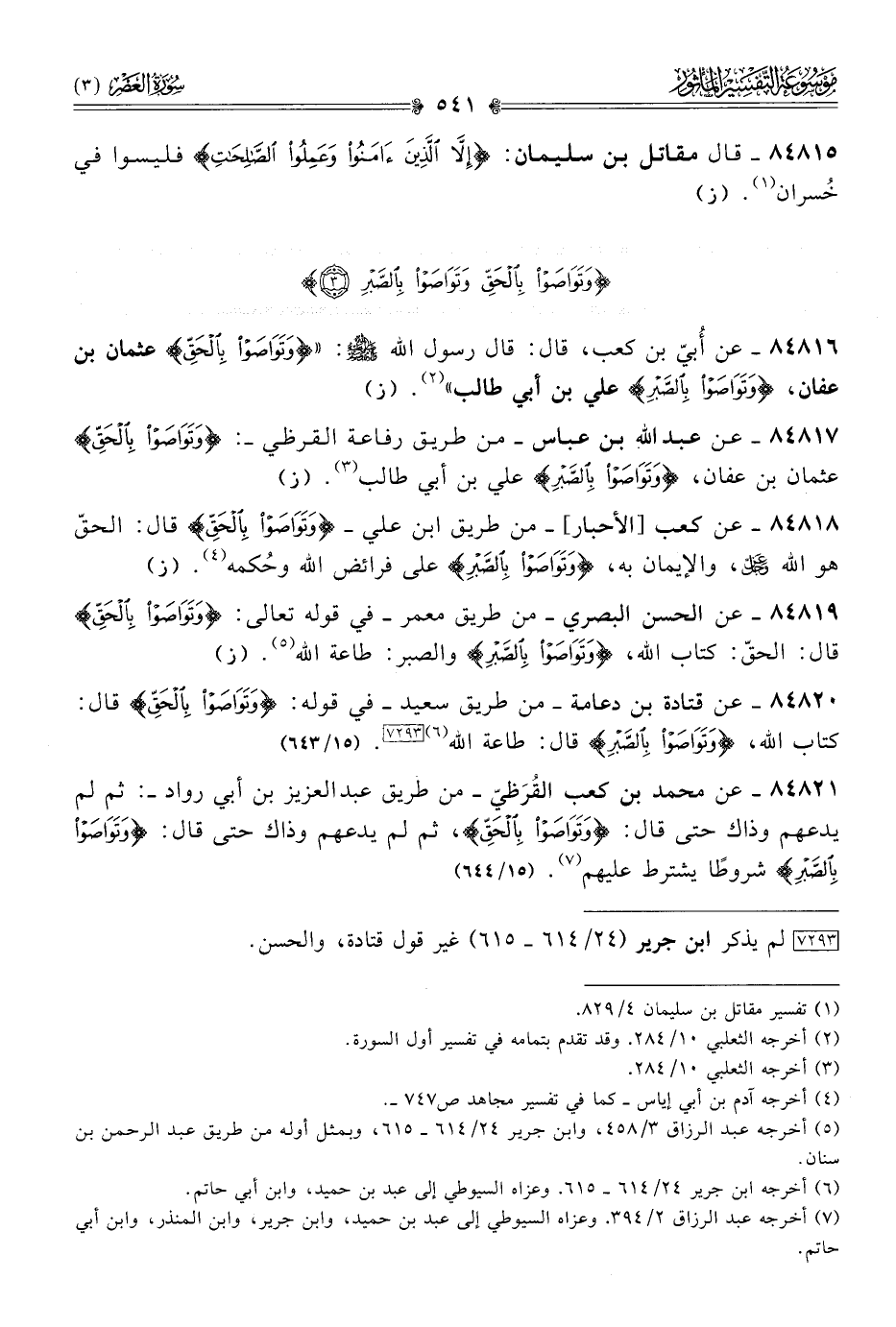 ٨٤٨١٨ - عن كعب [الأحبار]-من طريق ابن علي- {وتَواصَوْا بِالحَقِّ} قال: الحقّ هو الله - عز وجل -، والإيمان به، {وتَواصَوْا بِالصَّبْرِ} على فرائض الله وحُكمه (¬٤). (ز)