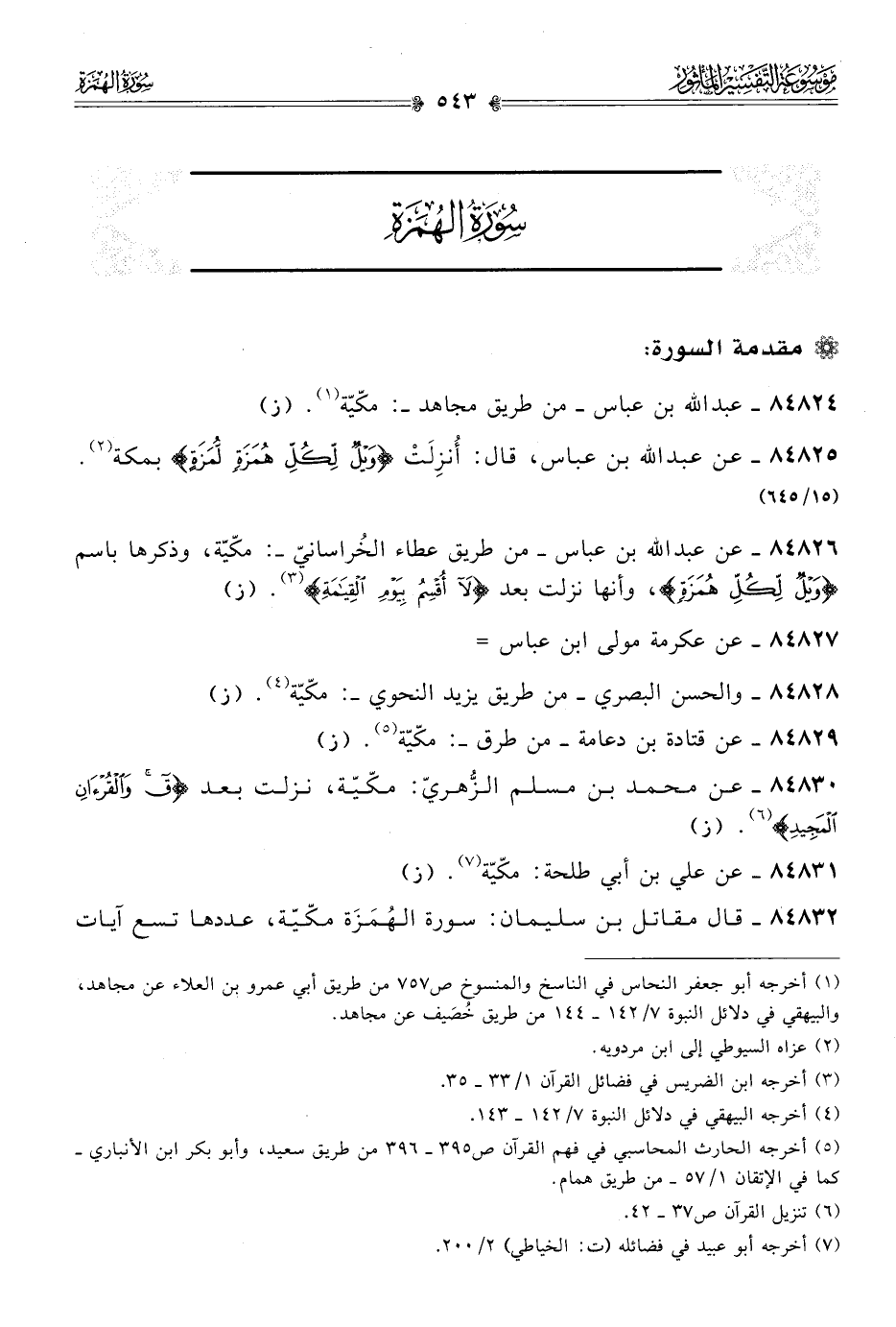 ٨٤٨٣٢ - قال مقاتل بن سليمان: سورة الهُمَزَة مكّيّة، عددها تسع آيات