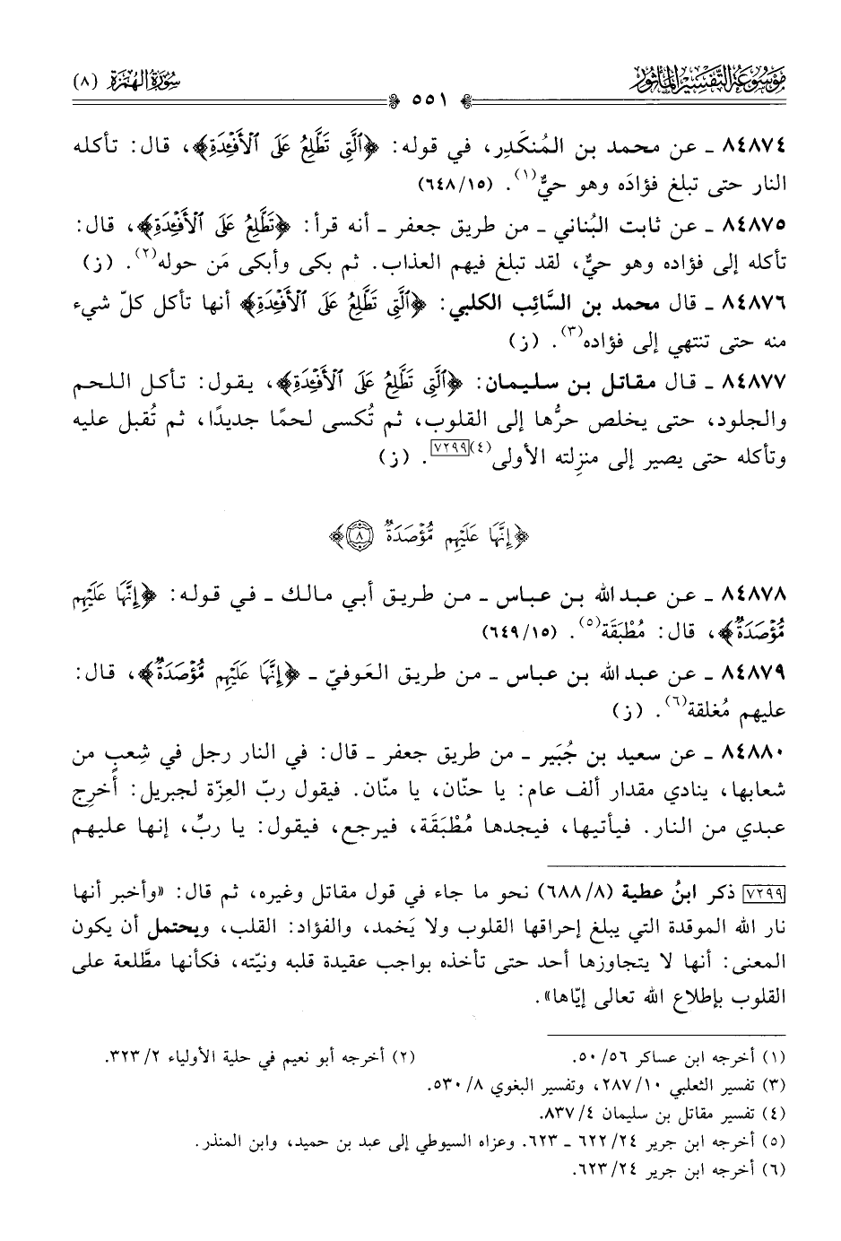 ٨٤٨٧٤ - عن محمد بن المُنكَدِر، في قوله: {الَّتِي تَطَّلِعُ عَلى الأَفْئِدَةِ}، قال: تأكله النار حتى تبلغ فؤادَه وهو حيٌّ (¬١). (١٥/ ٦٤٨)