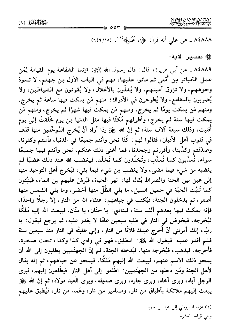 ٨٤٨٨٩ - عن أبي هريرة، قال: قال رسول الله - صلى الله عليه وسلم -: «إنما الشفاعة يوم القيامة لِمَن عمل الكبائر مِن أُمّتي ثم ماتوا عليها، فهم في الباب الأول مِن جهنم، لا تسودّ وجوههم، ولا تزرقّ أعينهم، ولا يُغلّون بالأغلال، ولا يُقرنون مع الشياطين، ولا يُضربون بالمقامع، ولا يُطرحون في الأدراك؛ منهم مَن يمكث فيها ساعة ثم يخرج، ومنهم مَن يمكث يومًا ثم يخرج، ومنهم مَن يمكث فيها شهرًا ثم يخرج، ومنهم مَن يمكث فيها سنة ثم يخرج، وأطولهم مُكثًا فيها مثل الدنيا مِن يوم خُلقتْ إلى يوم أُفنيتْ، وذلك سبعة آلاف سنة، ثم إنّ الله - عز وجل - إذا أراد أنْ يُخرج المُوحِّدين منها قذف في قلوب أهل الأديان، فقالوا لهم: كُنّا نحن وأنتم جميعًا في الدنيا، فآمنتم وكفرنا، وصدّقتم وكذّبنا، وأقررتم وجحدنا، فما أغنى ذلك عنكم، نحن وأنتم فيها جميعًا سواء، تُعذّبون كما نُعذّب، وتُخلّدون كما نُخلّد. فيغضب الله عند ذلك غضبًا لم يغضبه من شيء فيما مضى، ولا يغضب مِن شيء فيما بقي، فيُخرج أهل التوحيد منها إلى عين بين الجنة والصراط يُقال لها: نهر الحياة، فيُرشّ عليهم مِن الماء، فيَنبُتون كما تَنبُت الحبّة في حميل السيل، ما يلي الظِّلّ منها أخضر، وما يلي الشمس منها أصفر، ثم يدخلون الجنة، فيُكتب في جباههم: عتقاء الله من النار، إلا رجلًا واحدًا، فإنه يمكث فيها بعدهم ألف سنة، فينادي: يا حنّان، يا منّان. فيبعث الله إليه مَلكًا ليُخرجه، فيخوض في النار في طلبه سبعين عامًا لا يقدر عليه، ثم يرجع فيقول: يا ربِّ، إنك أمرتني أنْ أُخرج عبدك فلانًا من النار، وإني طلبتُه في النار منذ سبعين سنة فلم أقدر عليه. فيقول الله - عز وجل -: انطلِق، فهو في وادي كذا وكذا، تحت صخرة، فأخرِجه. فيذهب، فيُخرجه منها، فيُدخله الجنة، ثم إنّ الجهنّميين يطلبون إلى الله أن يمحو ذلك الاسم عنهم، فيبعث الله إليهم مَلكًا، فيمحو عن جباههم، ثم إنه يقال لأهل الجنة ومَن دخلها من الجهنّميين: اطّلعوا إلى أهل النار. فيطّلعون إليهم، فيرى الرجل أباه، ويرى أخاه، ويرى جاره، ويرى صديقه، ويرى العبد مولاه، ثم إنّ الله - عز وجل - يبعث إليهم ملائكة بأطباق من نار، ومسامير من نار، وعَمد من نار، فيُطبق عليهم