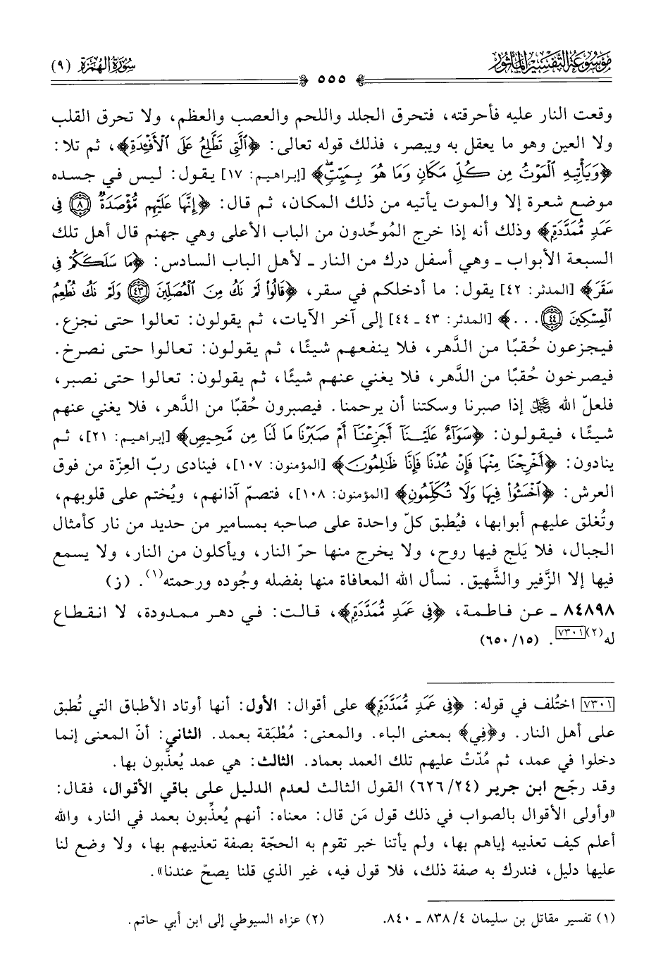 وقعت النار عليه فأحرقته، فتحرق الجلد واللحم والعصب والعظم، ولا تحرق القلب ولا العين وهو ما يعقل به ويبصر، فذلك قوله تعالى: {الَّتِي تَطَّلِعُ عَلى الأَفْئِدَةِ}، ثم تلا: {ويَأْتِيهِ المَوْتُ مِن كُلِّ مَكانٍ وما هُوَ بِمَيِّتٍ} [إبراهيم: ١٧] يقول: ليس في جسده موضع شعرة إلا والموت يأتيه من ذلك المكان، ثم قال: {إنَّها عَلَيْهِمْ مُؤْصَدَةٌ فِي عَمَدٍ مُمَدَّدَةٍ} وذلك أنه إذا خرج المُوحِّدون من الباب الأعلى وهي جهنم قال أهل تلك السبعة الأبواب -وهي أسفل درك من النار- لأهل الباب السادس: {ما سَلَكَكُمْ فِي سَقَرَ} [المدثر: ٤٢] يقول: ما أدخلكم في سقر، {قالُوا لَمْ نَكُ مِنَ المُصَلِّينَ ولَمْ نَكُ نُطْعِمُ المِسْكِينَ ... } [المدثر: ٤٣ - ٤٤] إلى آخر الآيات، ثم يقولون: تعالوا حتى نجزع. فيجزعون حُقبًا من الدَّهر، فلا ينفعهم شيئًا، ثم يقولون: تعالوا حتى نصرخ. فيصرخون حُقبًا من الدَّهر، فلا يغني عنهم شيئًا، ثم يقولون: تعالوا حتى نصبر، فلعلّ الله - عز وجل - إذا صبرنا وسكتنا أن يرحمنا. فيصبرون حُقبًا من الدَّهر، فلا يغني عنهم شيئًا، فيقولون: {سَواءٌ عَلَيْنا أجَزِعْنا أمْ صَبَرْنا ما لَنا مِن مَحِيصٍ} [إبراهيم: ٢١]، ثم ينادون: {أخْرِجْنا مِنها فَإنْ عُدْنا فَإنّا ظالِمُونَ} [المؤمنون: ١٠٧]، فينادى ربّ العِزّة من فوق العرش: {اخْسَئُوا فِيها ولا تُكَلِّمُونِ} [المؤمنون: ١٠٨]، فتصمّ آذانهم، ويُختم على قلوبهم، وتُغلق عليهم أبوابها، فيُطبق كلّ واحدة على صاحبه بمسامير من حديد من نار كأمثال الجبال، فلا يَلج فيها روح، ولا يخرج منها حرّ النار، ويأكلون من النار، ولا يسمع فيها إلا الزَّفير والشَّهيق. نسأل الله المعافاة منها بفضله وجُوده ورحمته (¬١). (ز)