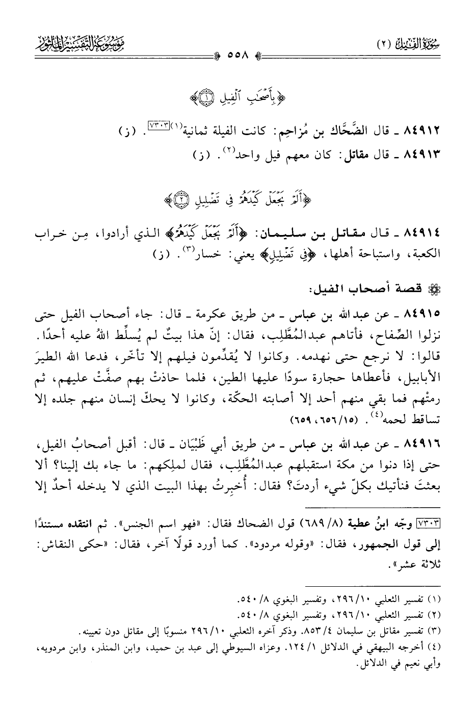 ٨٤٩١٢ - قال الضَّحّاك بن مُزاحِم: كانت الفيلة ثمانية (¬١) [٧٣٠٣]. (ز)