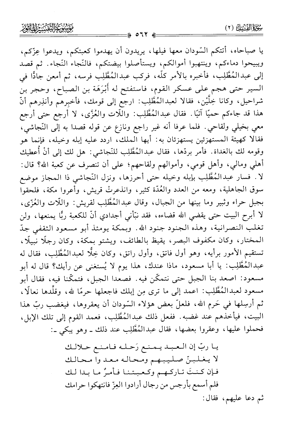 يا صباحاه، أتتكم السّودان معها فيلها، يريدون أن يهدموا كعبتكم، ويدعوا عِزّكم، ويبيحوا دماءكم، وينتهبوا أموالكم، ويستأصلوا بيضتكم، فالنّجاء النّجاء. ثم قصد إلى عبد المُطَّلِب، فأخبره بالأمر كلّه، فركب عبد المُطَّلِب فرسه، ثم أمعن جادًّا في السير حتى هجم على عسكر القوم، فاستفتح له أبْرَهَة بن الصباح، وحجر بن شراحيل، وكانا خِلَّيْن، فقالا لعبد المُطَّلِب: ارجع إلى قومك، فأخبِرهم وأنذِرهم أنّ هذا قد جاءكم حميًا آتيًا. فقال عبد المُطَّلِب: واللّات والعُزّى، لا أرجع حتى أرجع معي بخيلي ولقاحي. فلما عرفا أنه غير راجع ونازع عن قوله قصدا به إلى النّجاشي، فقالا كهيئة المستهزئين يستهزئان به: أيها الملك، اردد عليه إبله وخيله، فإنما هو وقومه لك بالغداة. فأمر بردّها، فقال عبد المُطَّلِب للنّجاشي: هل لك إلى أنْ أُعطيك أهلي ومالي، وأهل قومي، وأموالهم ولقاحهم؛ على أن تنصرف عن كعبة الله؟ قال: لا. فسار عبد المُطَّلِب بإبله وخيله حتى أحرزها، ونزل النّجاشي ذا المجاز موضع سوق الجاهلية، ومعه من العدد والعُدّة كثير، وانذعرتْ قريش، وأعروا مكة، فلحقوا بجبل حراء وثبير وما بينها من الجبال، وقال عبد المُطَّلِب لقريش: واللّات والعُزّى، لا أبرح البيت حتى يقضي الله قضاءه، فقد نبّأني أجدادي أنّ للكعبة ربًّا يمنعها، ولن تغلب النصرانية، وهذه الجنود جنود الله. وبمكة يومئذ أبو مسعود الثقفي جدّ المختار، وكان مكفوف البصر، يقيظ بالطائف، ويشتو بمكة، وكان رجلًا نبيلًا، تستقيم الأمور برأيه، وهو أول فاتق، وأول راتق، وكان خِلًّا لعبد المُطَّلِب، فقال له عبد المُطَّلِب: يا أبا مسعود، ماذا عندك، هذا يوم لا يُستغنى عن رأيك؟ قال له أبو مسعود: اصعد بنا الجبل حتى نتمكّن فيه. فصعدا الجبل، فتمكّنا فيه، فقال أبو مسعود لعبد المُطَّلِب: اعمد إلى ما ترى مِن إبلك فاجعلها حرمًا لله، وقلِّدها نعالًا، ثم أرسِلها في حَرم الله، فلعلّ بعض هؤلاء السّودان أن يعقروها، فيغضب ربّ هذا البيت، فيأخذهم عند غضبه. ففعل ذلك عبد المُطَّلِب، فعمد القوم إلى تلك الإبل، فحملوا عليها، وعقروا بعضها، فقال عبد المُطَّلِب عند ذلك-وهو يبكي-: