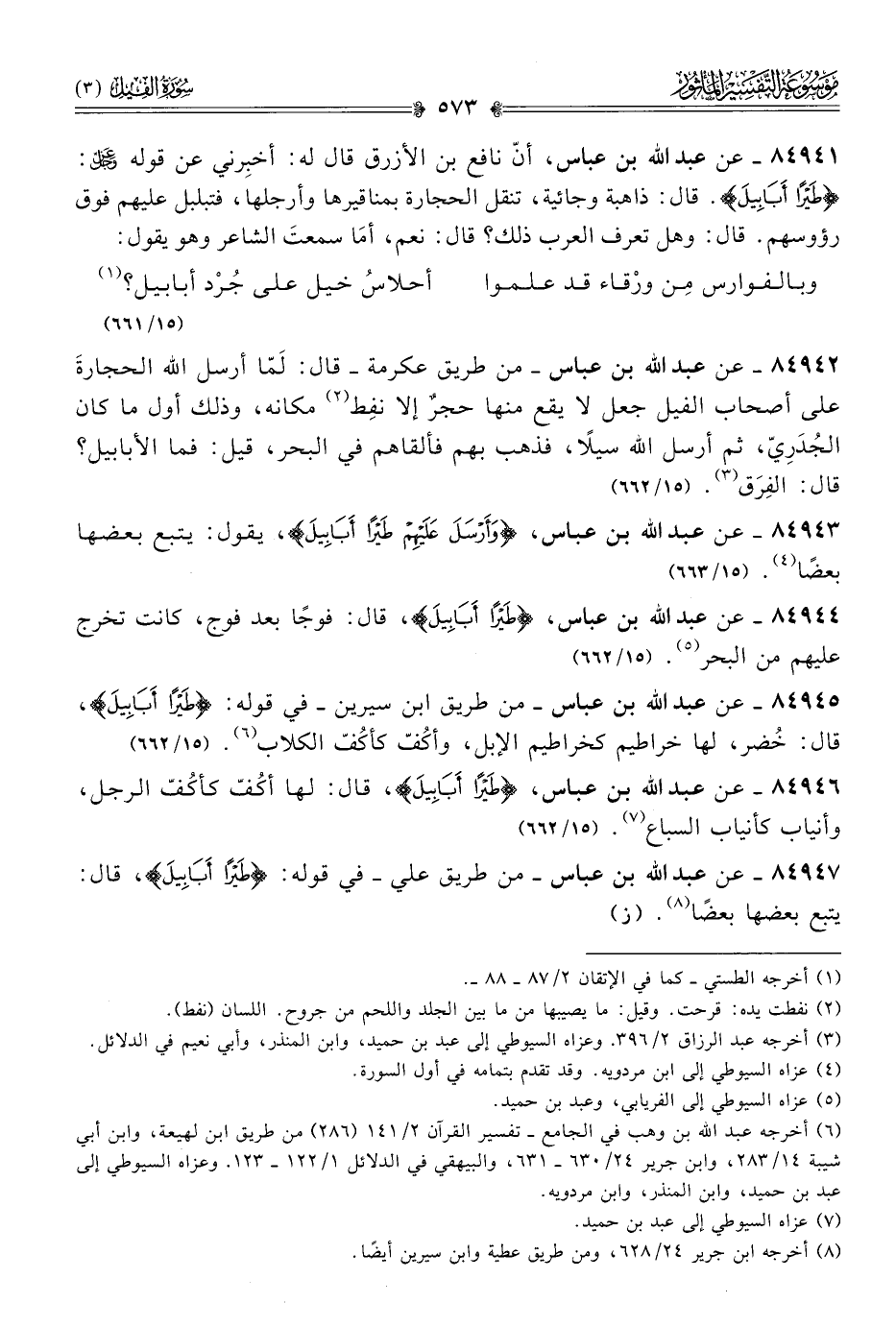 ٨٤٩٤٣ - عن عبد الله بن عباس، {وأَرْسَلَ عَلَيْهِمْ طَيْرًا أبابِيلَ}، يقول: يتبع بعضها بعضًا (¬٤). (١٥/ ٦٦٣)