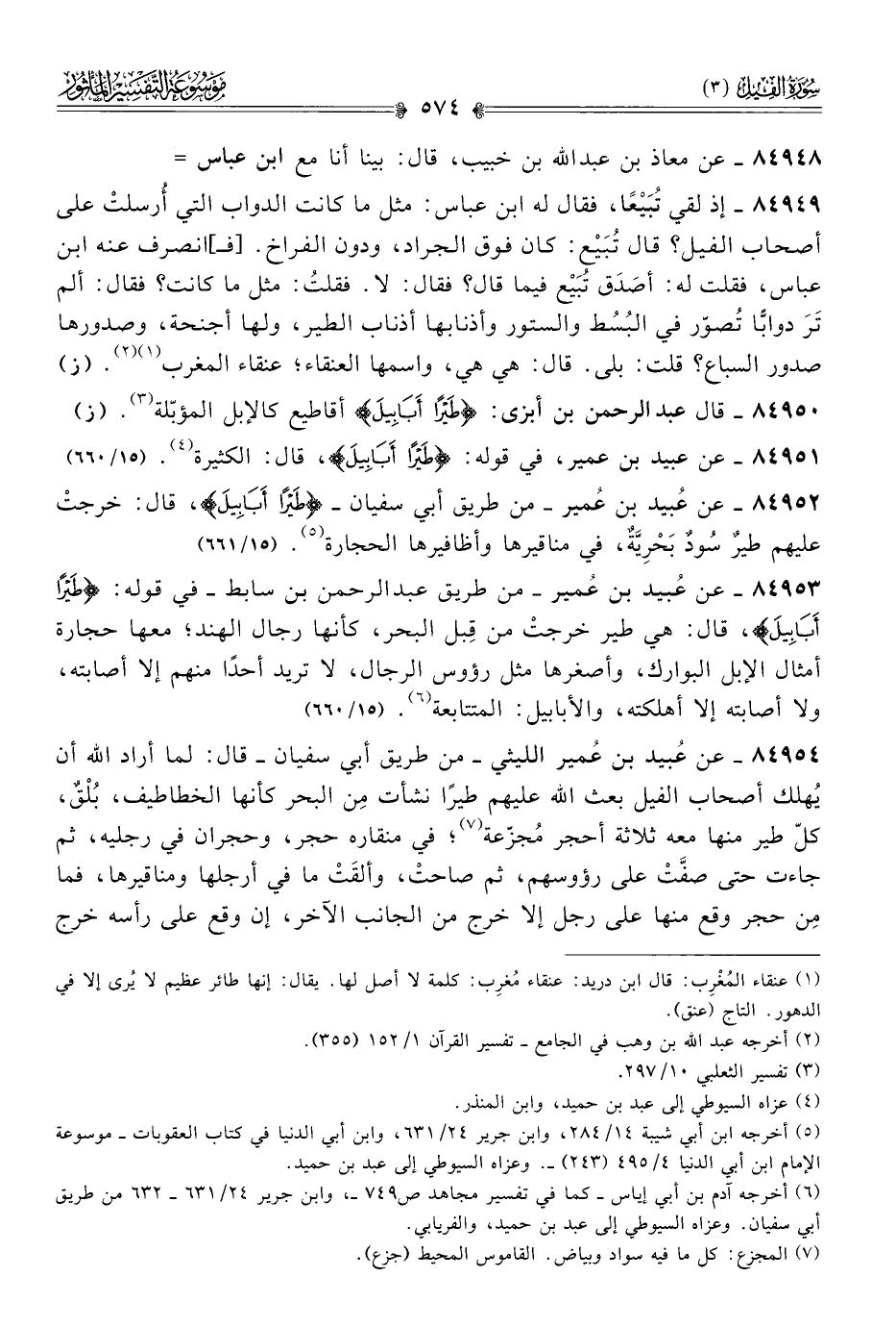 ٨٤٩٤٩ - إذ لقي تُبَيْعًا، فقال له ابن عباس: مثل ما كانت الدواب التي أُرسلتْ على أصحاب الفيل؟ قال تُبَيْع: كان فوق الجراد، ودون الفراخ. [فـ] انصرف عنه ابن عباس، فقلت له: أصَدَق تُبَيْع فيما قال؟ فقال: لا. فقلتُ: مثل ما كانت؟ فقال: ألم تَرَ دوابًّا تُصوّر في البُسُط والستور وأذنابها أذناب الطير، ولها أجنحة، وصدورها صدور السباع؟ قلت: بلى. قال: هي هي، واسمها العنقاء؛ عنقاء المغرب (¬١) (¬٢). (ز)