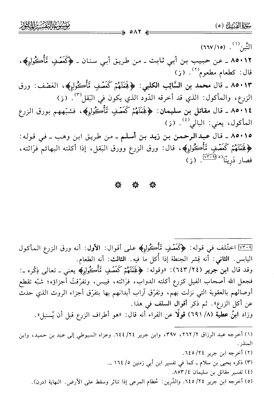[٧٣٠٩] اختُلف في قوله: {كعصف مأكول} على أقوال: الأول: أنه ورق الزرع المأكول اليابس. الثاني: أنه قِشر الحِنطة إذا أُكل ما فيه. الثالث: أنه الطعام.