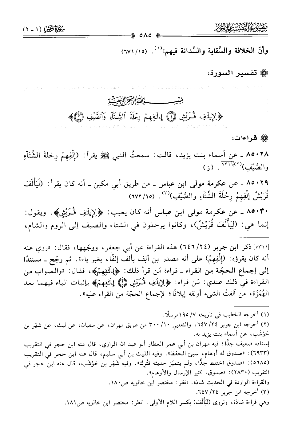 ٨٥٠٣٠ - عن عكرمة مولى ابن عباس أنه كان يعيب: {لِإيلافِ قُرَيْشٍ}. ويقول: إنما هي: (لِيَأْلَفَ قُرَيْشٌ)، وكانوا يرحلون في الشتاء والصيف إلى الروم والشام،