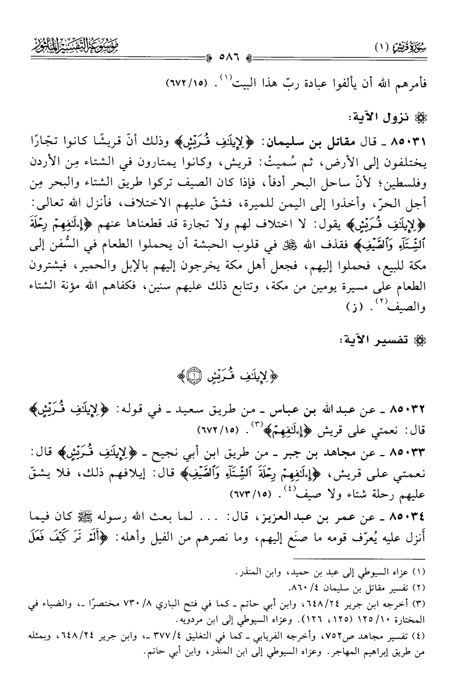 ٨٥٠٣٢ - عن عبد الله بن عباس -من طريق سعيد- في قوله: {لِإيلافِ قُرَيْشٍ} قال: نعمتي على قريش {إيلافِهِمْ} (¬٣). (١٥/ ٦٧٢)