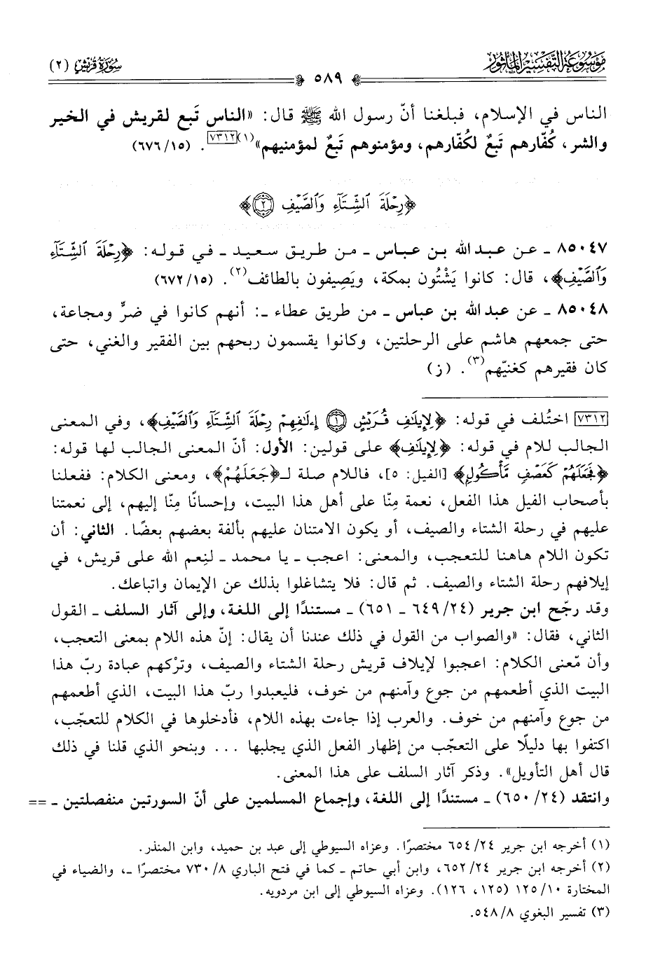 ٨٥٠٤٧ - عن عبد الله بن عباس -من طريق سعيد- في قوله: {رِحْلَةَ الشِّتاءِ والصَّيْفِ}، قال: كانوا يَشْتُون بمكة، ويَصِيفون بالطائف (¬٢). (١٥/ ٦٧٢)