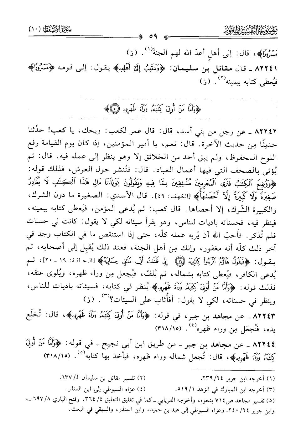 ٨٢٢٤٣ - عن مجاهد بن جبر، في قوله: {وأَمّا مَن أُوتِيَ كِتابَهُ وراءَ ظَهْرِهِ}، قال: تُخلَع يده، فتُجعَل مِن وراء ظهره (¬٤). (١٥/ ٣١٨)