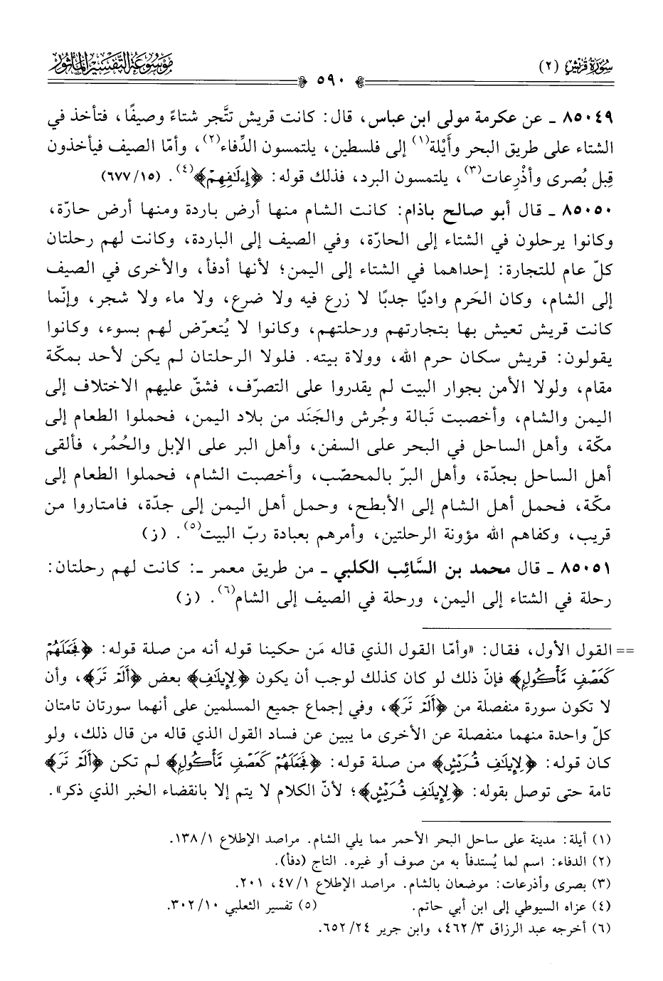 ٨٥٠٥١ - قال محمد بن السّائِب الكلبي -من طريق معمر-: كانت لهم رحلتان: رحلة في الشتاء إلى اليمن، ورحلة في الصيف إلى الشام (¬٦). (ز)