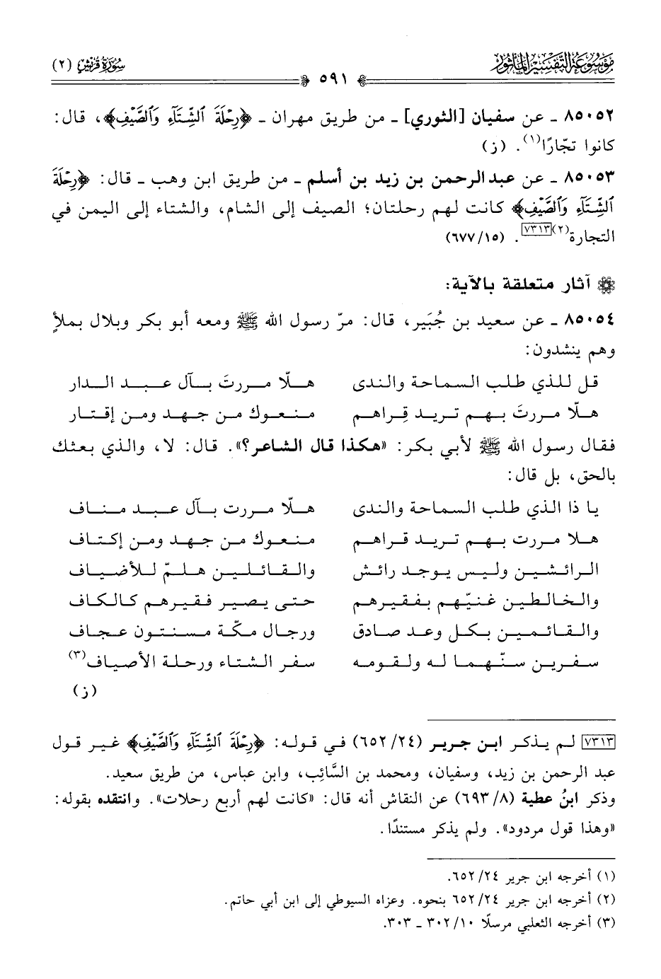 [٧٣١٣] لم يذكر ابنُ جرير (٢٤/ ٦٥٢) في قوله: {رحلة الشتاء والصيف} غير قول عبد الرحمن بن زيد، وسفيان، ومحمد بن السّائِب، وابن عباس، من طريق سعيد.