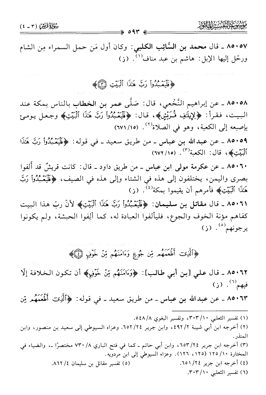 ٨٥٠٥٩ - عن عبد الله بن عباس -من طريق سعيد- في قوله: {فَلْيَعْبُدُوا رَبَّ هَذا البَيْتِ}، قال: الكعبة (¬٣). (١٥/ ٦٧٢)