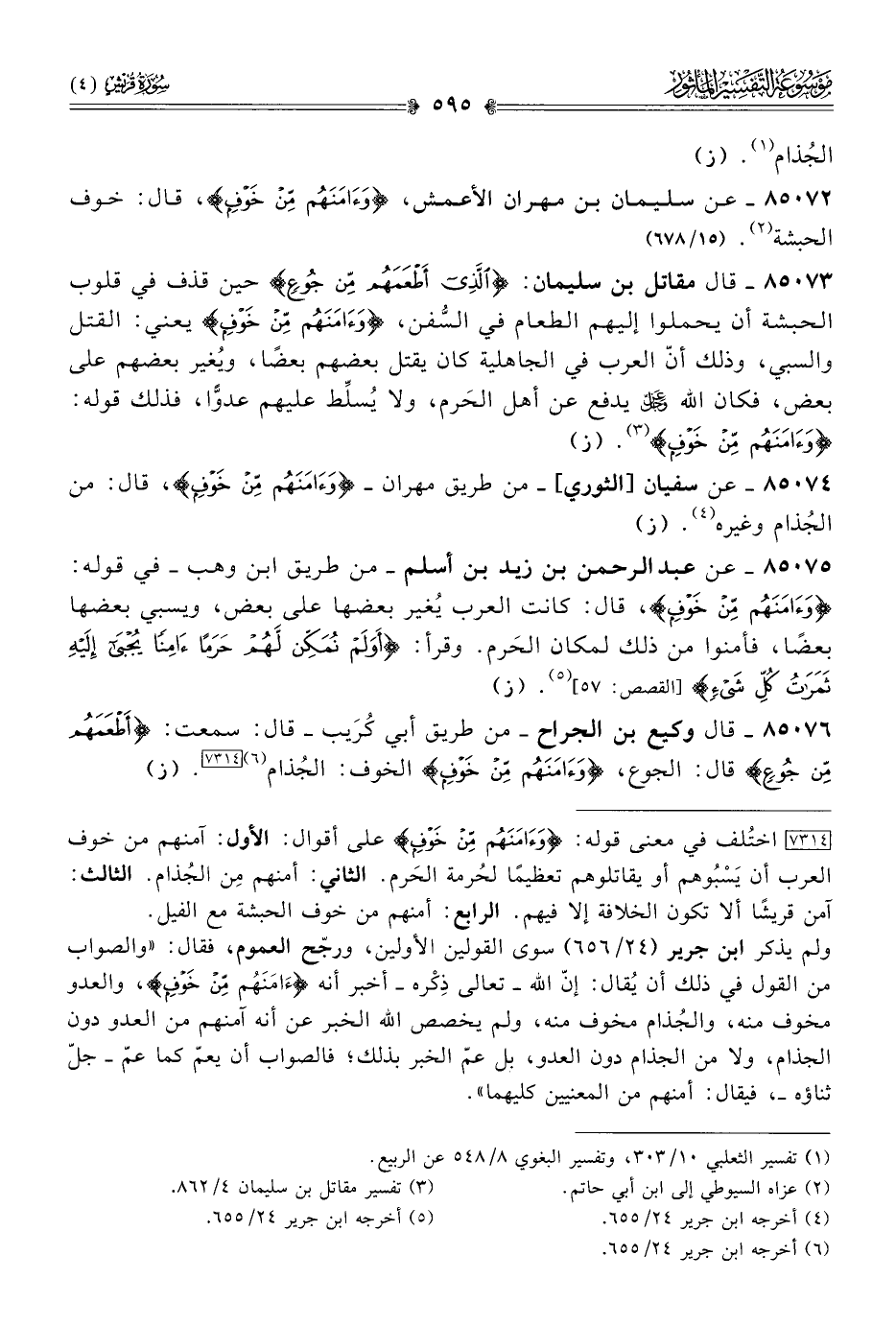 ٨٥٠٧٤ - عن سفيان [الثوري]-من طريق مهران- {وآمَنَهُمْ مِن خَوْفٍ}، قال: من الجُذام وغيره (¬٤). (ز)