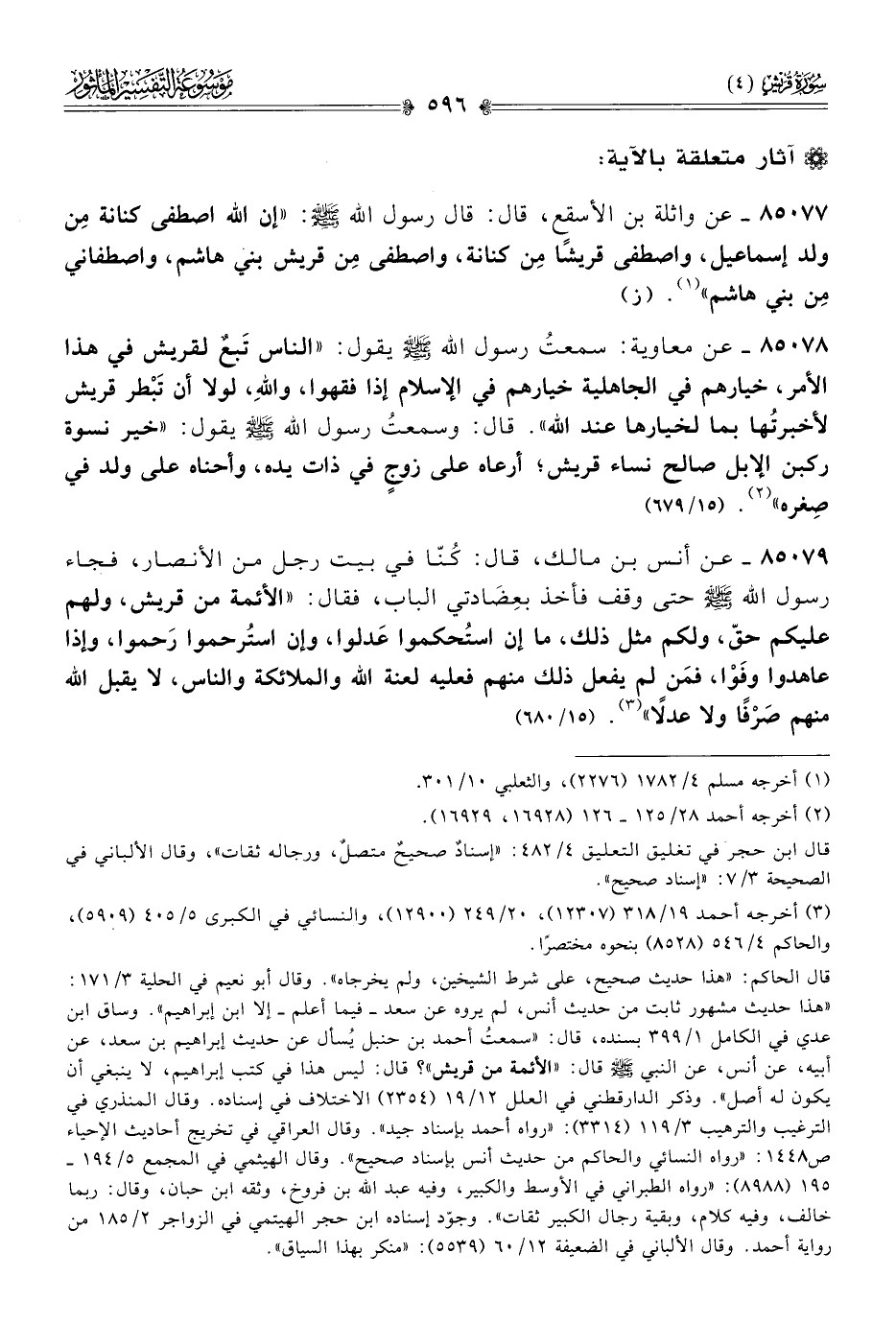 ٨٥٠٧٧ - عن واثلة بن الأسقع، قال: قال رسول الله - صلى الله عليه وسلم -: «إن الله اصطفى كنانة مِن ولد إسماعيل، واصطفى قريشًا مِن كنانة، واصطفى مِن قريش بني هاشم، واصطفاني مِن بني هاشم» (¬١). (ز)