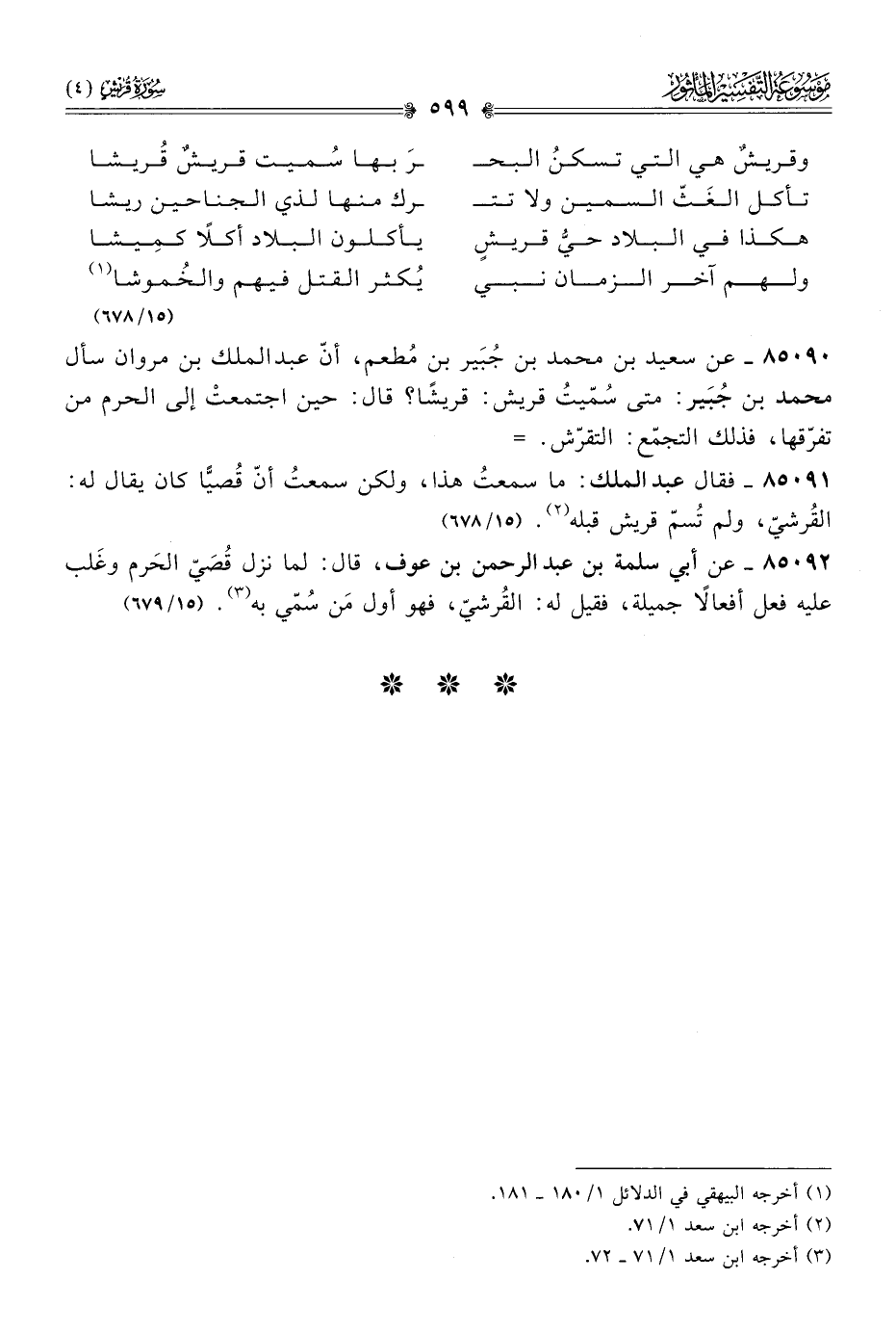 ٨٥٠٩٢ - عن أبي سلمة بن عبد الرحمن بن عوف، قال: لما نزل قُصَيّ الحَرم وغَلب عليه فعل أفعالًا جميلة، فقيل له: القُرشيّ، فهو أول مَن سُمّي به (¬٣). (١٥/ ٦٧٩)