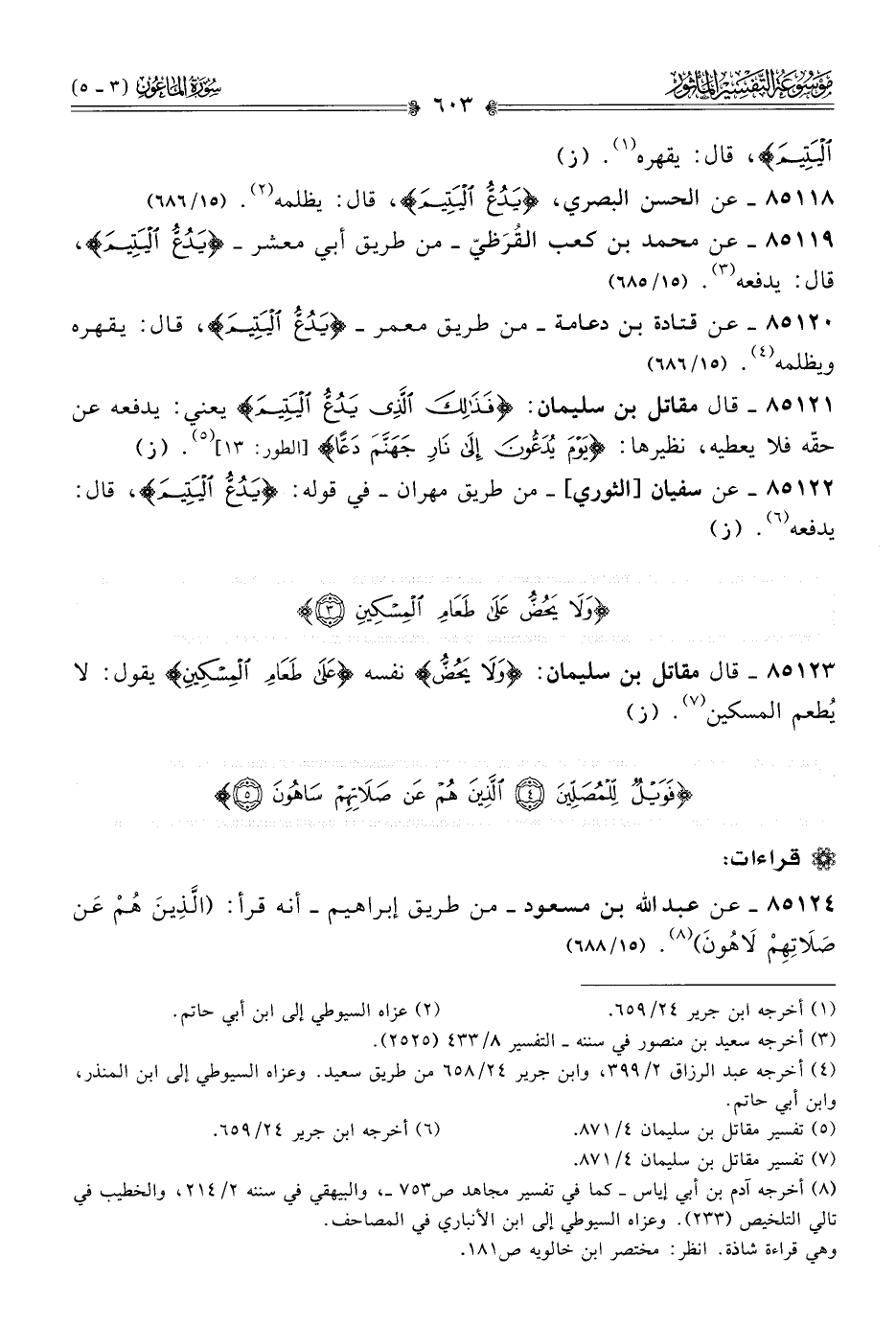 ٨٥١٢٢ - عن سفيان [الثوري]-من طريق مهران- في قوله: {يَدُعُّ اليَتِيمَ}، قال: يدفعه (¬٦). (ز)
