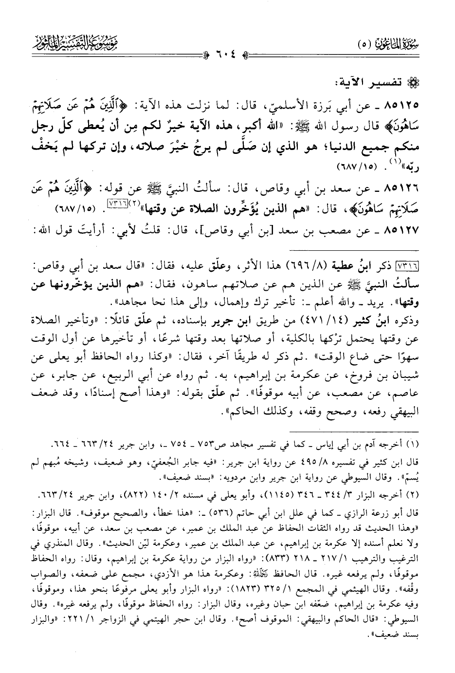 [٧٣١٦] ذكر ابنُ عطية (٨/ ٦٩٦) هذا الأثر، وعلّق عليه، فقال: «قال سعد بن أبي وقاص: سألتُ النبيَّ - صلى الله عليه وسلم - عن الذين هم عن صلاتهم ساهون، فقال: «هم الذين يؤخّرونها عن وقتها». يريد -والله أعلم-: تأخير ترك وإهمال، وإلى هذا نحا مجاهد».