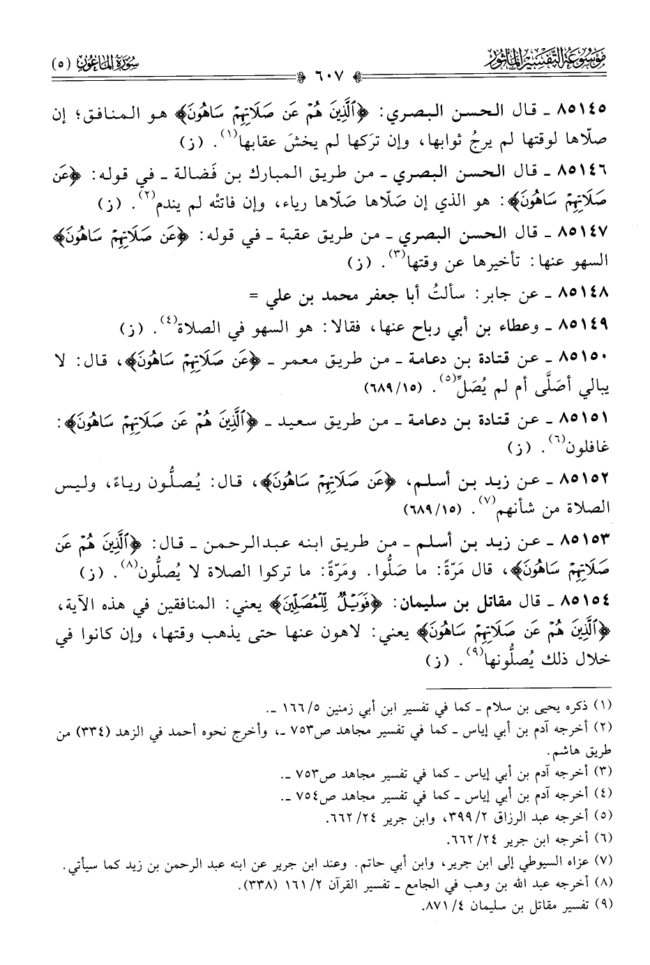 ٨٥١٤٧ - قال الحسن البصري -من طريق عقبة- في قوله: {عَنْ صَلاتِهِمْ ساهُونَ} السهو عنها: تأخيرها عن وقتها (¬٣). (ز)