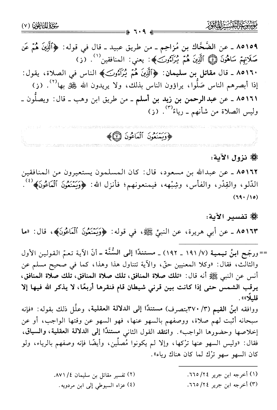 ٨٥١٥٩ - عن الضَّحّاك بن مُزاحِم -من طريق عبيد- قال في قوله: {الَّذِينَ هُمْ عَنْ صَلاتِهِمْ ساهُونَ الَّذِينَ هُمْ يُراءُونَ}: يعني: المنافقين (¬١). (ز)