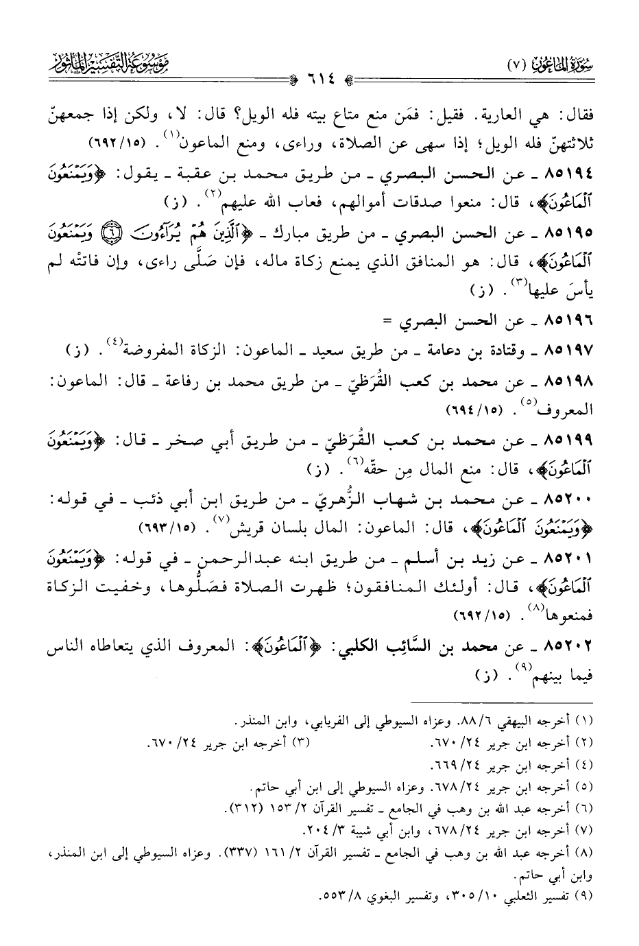 ٨٥١٩٧ - وقتادة بن دعامة -من طريق سعيد- الماعون: الزكاة المفروضة (¬٤). (ز)