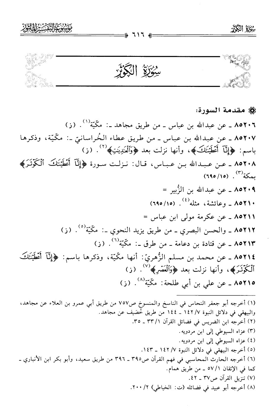 ٨٥٢١٤ - عن محمد بن مسلم الزُّهريّ: أنها مكّيّة، وذكرها بمسمّى: {إنا أعطيناك الكوثر}، وأنها نزلت بعد {والعصر} (¬٧). (ز)