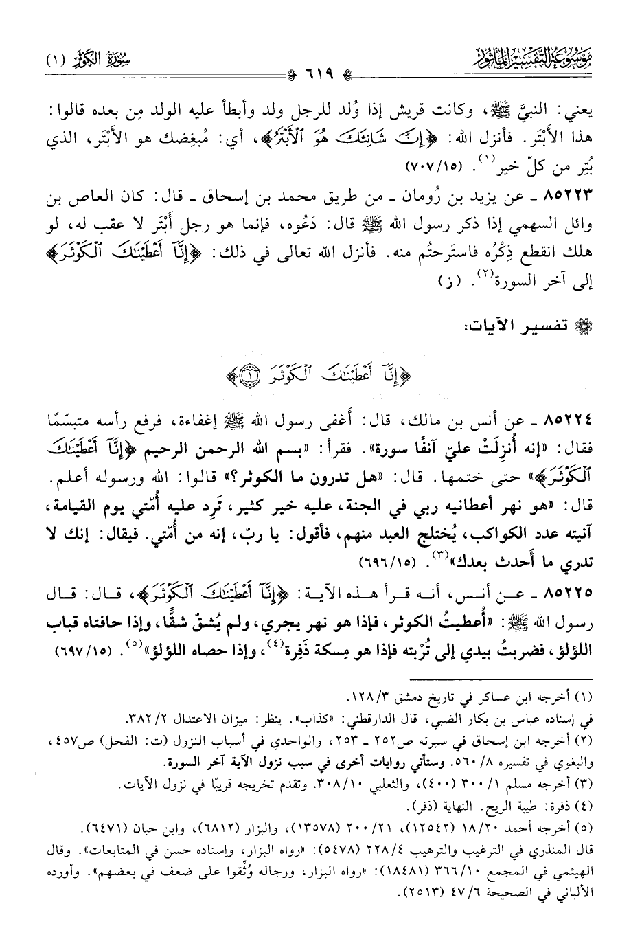 ٨٥٢٢٣ - عن يزيد بن رُومان -من طريق محمد بن إسحاق- قال: كان العاص بن وائل السهمي إذا ذكر رسول الله - صلى الله عليه وسلم - قال: دَعُوه، فإنما هو رجل أبْتَر لا عقب له، لو هلك انقطع ذِكْرُه فاستَرحتُم منه. فأنزل الله تعالى في ذلك: {إنّا أعْطَيْناكَ الكَوْثَرَ} إلى آخر السورة (¬٢). (ز)