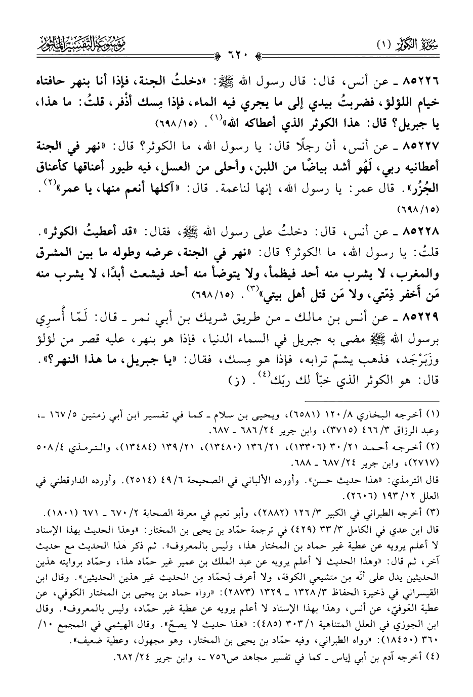 ٨٥٢٢٧ - عن أنس، أن رجلًا قال: يا رسول الله، ما الكوثر؟ قال: «نهر في الجنة أعطانيه ربي، لَهُو أشد بياضًا من اللبن، وأحلى من العسل، فيه طيور أعناقها كأعناق الجُزُر». قال عمر: يا رسول الله، إنها لناعمة. قال: «آكلها أنعم منها، يا عمر» (¬٢). (١٥/ ٦٩٨)