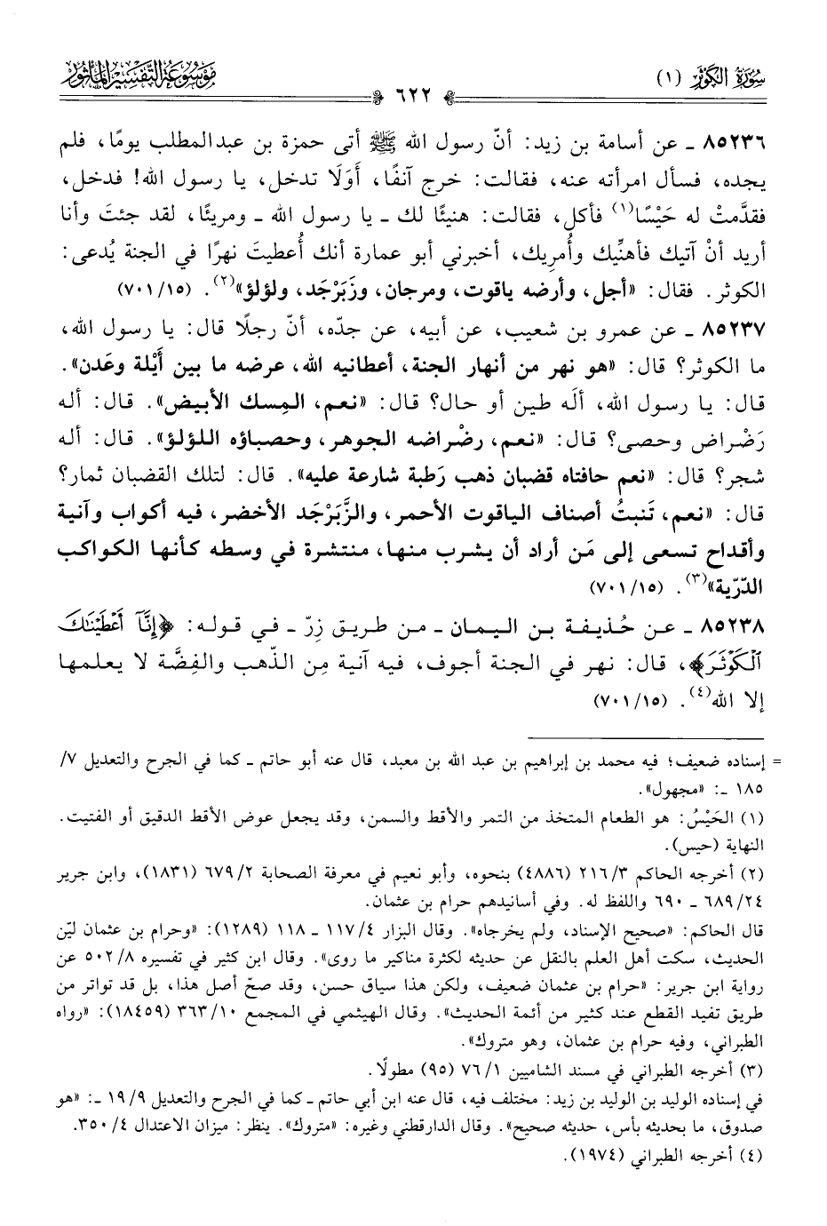 ٨٥٢٣٨ - عن حُذيفة بن اليمان -من طريق زِرّ- في قوله: {إنّا أعْطَيْناكَ الكَوْثَرَ}، قال: نهر في الجنة أجوف، فيه آنية مِن الذّهب والفِضَّة لا يعلمها إلا الله (¬٤). (١٥/ ٧٠١)