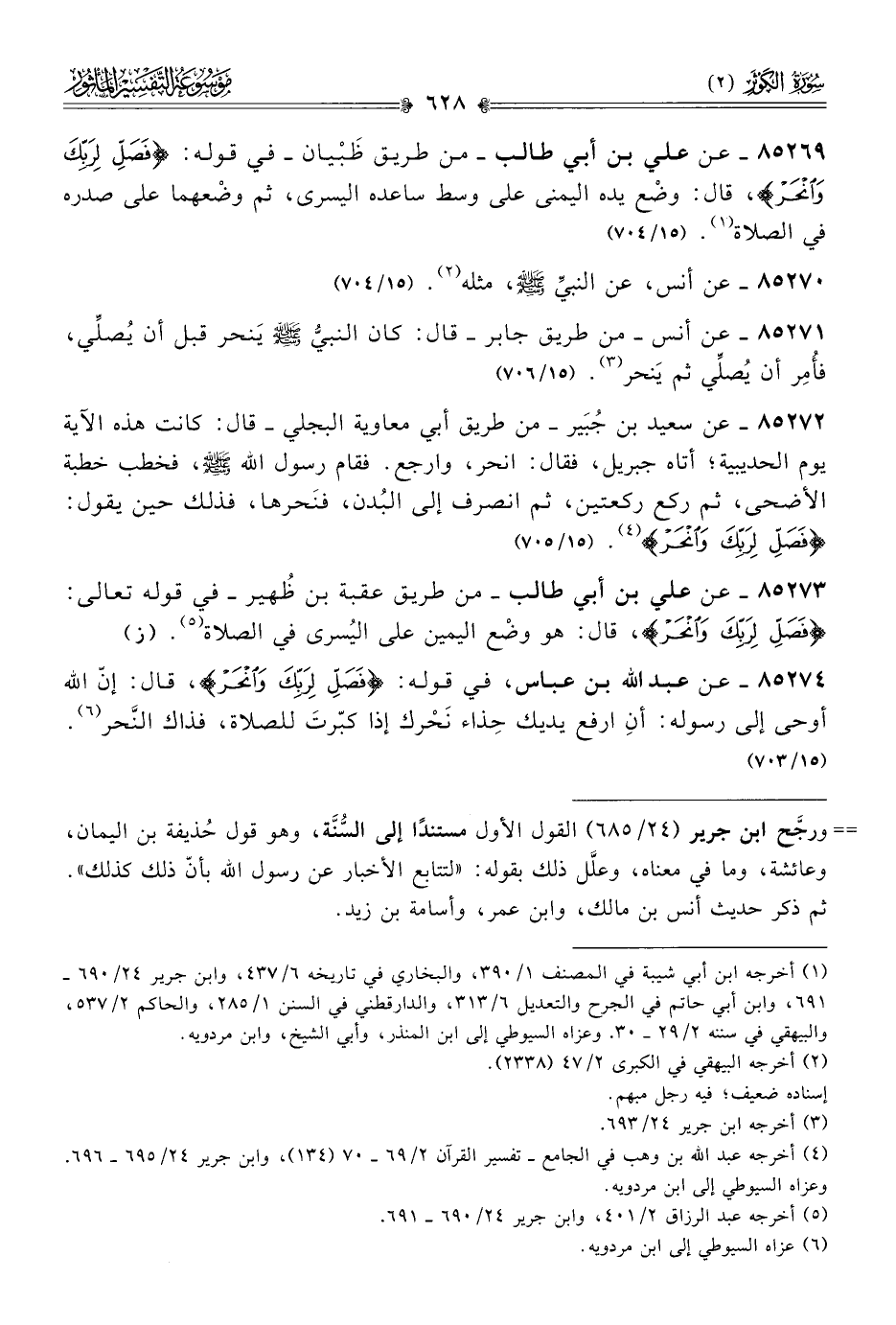 ٨٥٢٦٩ - عن علي بن أبي طالب -من طريق ظَبْيان- في قوله: {فَصَلِّ لِرَبِّكَ وانْحَرْ}، قال: وضْع يده اليمنى على وسط ساعده اليسرى، ثم وضْعهما على صدره في الصلاة (¬١). (١٥/ ٧٠٤)