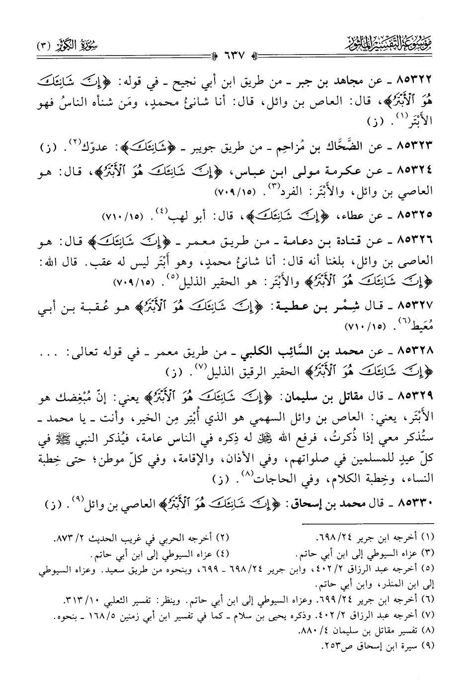 ٨٥٣٢٧ - قال شِمْر بن عطية: {إنَّ شانِئَكَ هُوَ الأَبْتَر} هو عُقبة بن أبي مُعَيط (¬٦). (١٥/ ٧١٠)