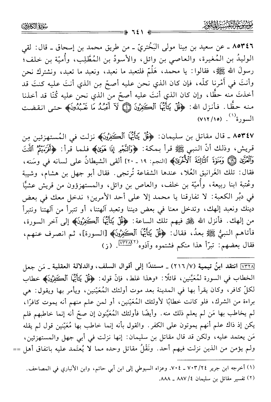[٧٣٢٨] انتقد ابنُ تيمية (٧/ ٢١٦) -مستندًا إلى أقوال السلف، والدلالة العقلية- مَن جعل الخطاب في السورة لمُعَيَّنين، قائلًا: «وهذا غلط، فإنّ قوله: {قُلْ يا أيُّها الكافِرُونَ} خطاب لكلّ كافر، وكان يقرأ بها في المدينة بعد موت أولئك المُعُيّنين، ويأمر بها ويقول: هي براءة من الشرك، فلو كانت خطابًا لأولئك المُعَيّنين، أو لمن علم منهم أنه يموت كافرًا، لم يخاطب بها مَن لم يعلم ذلك منه. وأيضًا فأولئك المُعَيَّنون إن صحّ أنه إنما خاطبهم فلم يكن إذ ذاك علم أنهم يموتون على الكفر. والقول بأنه إنما خاطب بها مُعَيّنين قول لم يقله مَن يعتمد عليه، ولكن قد قال مقاتل بن سليمان: إنها نزلت في أبي جهل والمستهزئين، ولم يؤمن من الذين نزلت فيهم أحد. ونَقْلُ مقاتل وحده مما لا يُعتَمد عليه باتفاق أهل الحديث، كنقل الكلبي، ولهذا كان المُصنِّفون في التفسير من أهل النقل لا يذكرون عن واحد منهما شيئًا كمحمد بن جرير، وعبد الرحمن بن أبي حاتم، وأبي بكر بن المنذر فضلًا عن مثل أحمد بن حنبل، وإسحاق بن راهويه، وقد ذكر غيره هذا عن قريش مطلقًا». ثم ذكر الأثر الثاني في سبب نزول السورة الوارد عن ابن عباس، والأثر الذي يليه عن وهب بن منبه، ثم ذكر الحديث الوارد في الآثار المتعلقة بالسورة مِن رواية نَوْفَل بن معاوية الأشجعيّ في أنّ سورة الكافرون براءة من الشرك، ثم علَّق عليه بقوله: «فقد أمر رسول الله واحدًا مِن المسلمين أن يقرأها، وأخبره أنها براءة من الشّرك، فلو كان الخطاب لِمَن يموت على الشّرك كانت براءة من دين أولئك فقط، لم تكن براءة من الشّرك الذي يسلم صاحبه فيما بعد، ومعلوم أنّ المقصود منها أن تكون براءة من كلّ شركٍ اعتقادي وعملي».