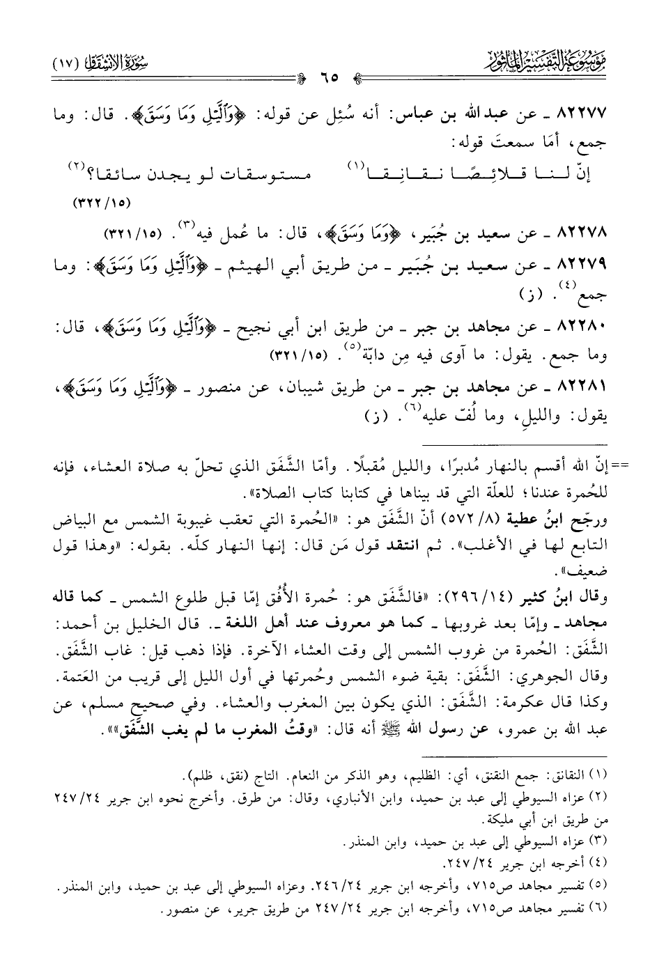٨٢٢٨٠ - عن مجاهد بن جبر -من طريق ابن أبي نجيح- {واللَّيْلِ وما وسَقَ}، قال: وما جمع. يقول: ما آوى فيه مِن دابّة (¬٥). (١٥/ ٣٢١)