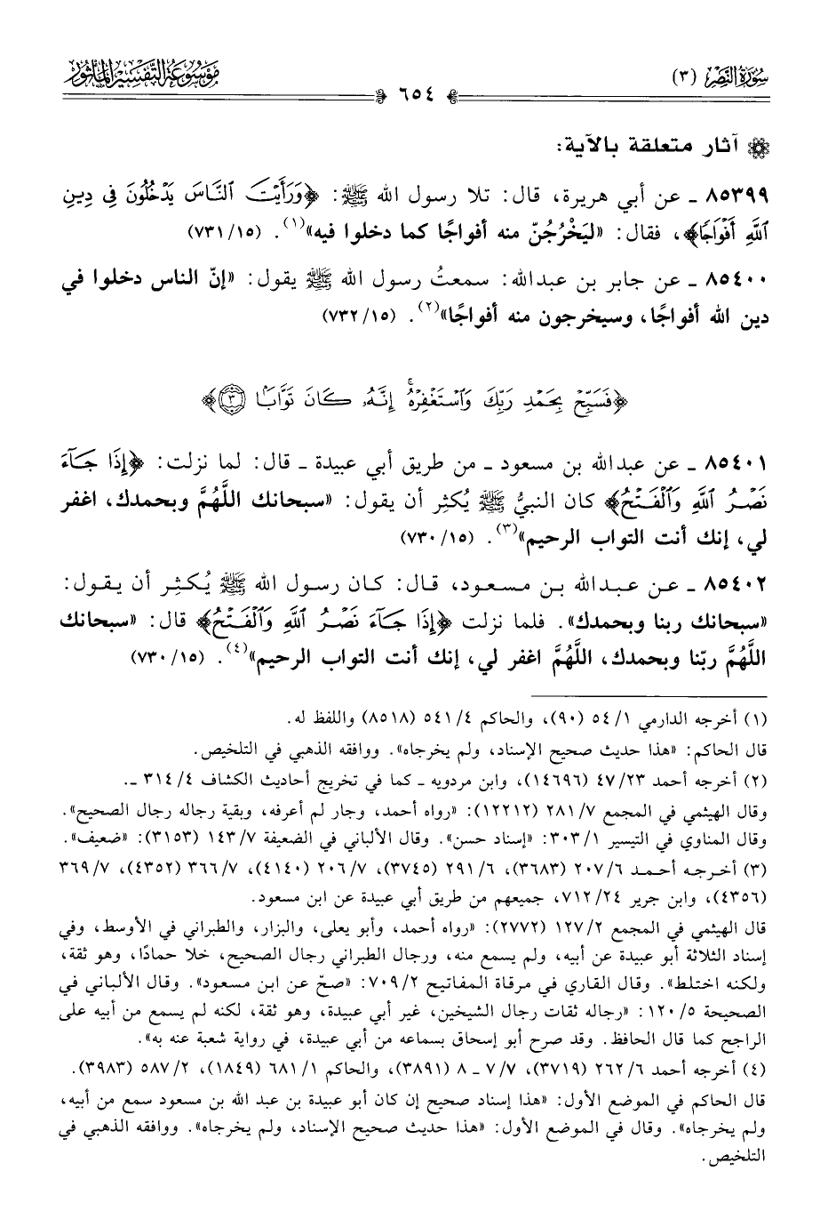 ٨٥٤٠٠ - عن جابر بن عبد الله: سمعتُ رسول الله - صلى الله عليه وسلم - يقول: «إنّ الناس دخلوا في دين الله أفواجًا، وسيخرجون منه أفواجًا» (¬٢). (١٥/ ٧٣٢)