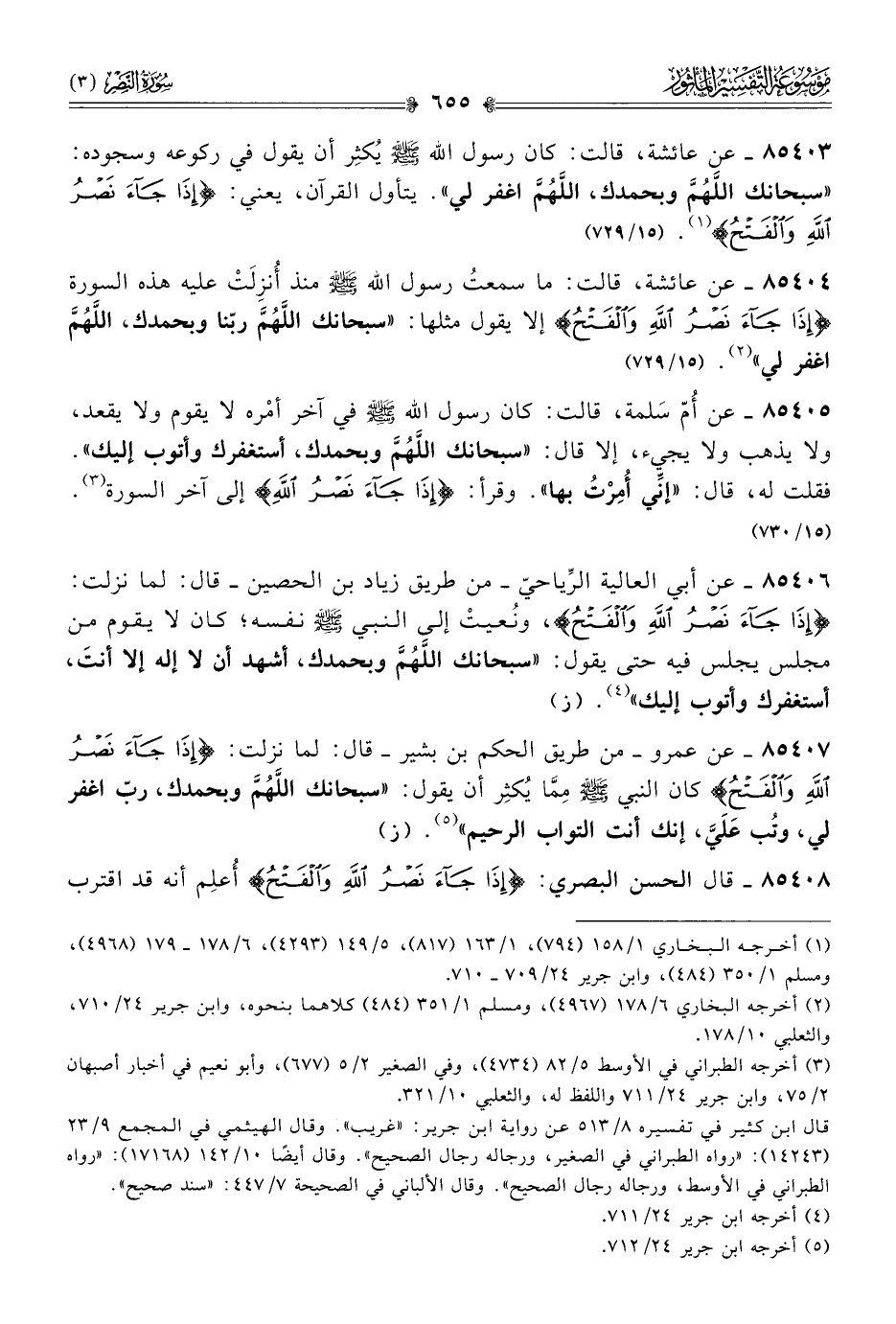 ٨٥٤٠٤ - عن عائشة، قالت: ما سمعتُ رسول الله - صلى الله عليه وسلم - منذ أُنزِلَتْ عليه هذه السورة {إذا جاءَ نَصْرُ اللَّهِ والفَتْحُ} إلا يقول مثلها: «سبحانك اللهم ربّنا وبحمدك، اللهم اغفر لي» (¬٢). (١٥/ ٧٢٩)