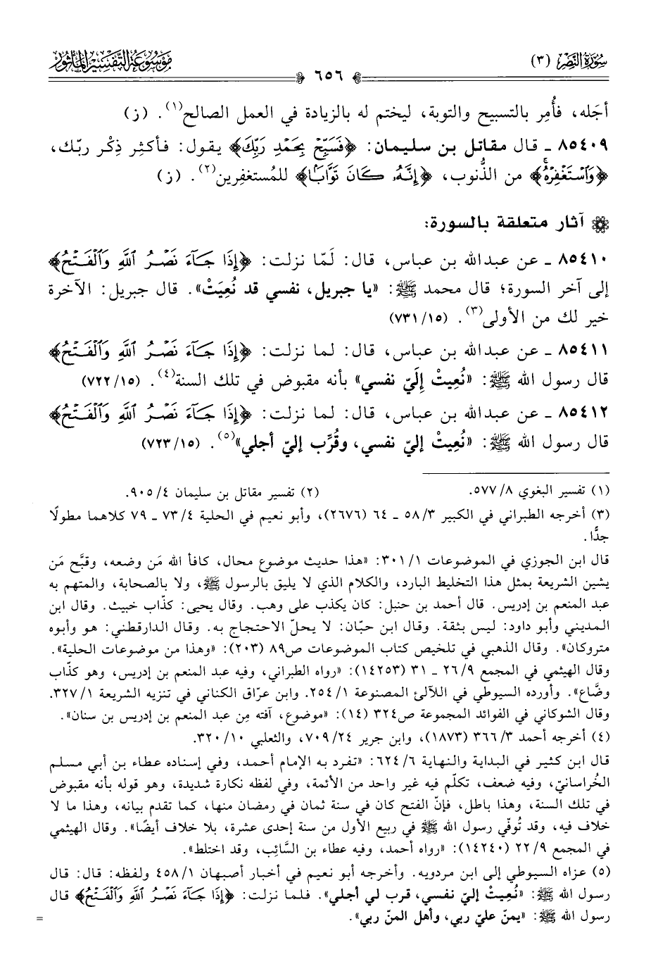 (¬٥) عزاه السيوطي إلى ابن مردويه. وأخرجه أبو نعيم في أخبار أصبهان ١/ ٤٥٨ ولفظه: قال: قال رسول الله - صلى الله عليه وسلم -: «نُعِيتْ إليّ نفسي، قرب لي أجلي». فلما نزلت: {إذا جاء نصر الله والفتح} قال رسول الله - صلى الله عليه وسلم -: «يمنّ عليّ ربي، وأهل المنّ ربي».