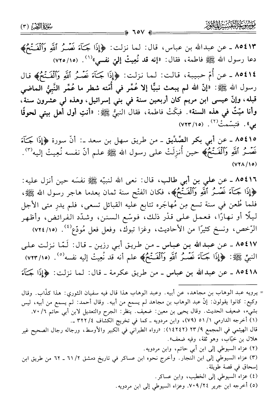 ٨٥٤١٥ - عن أبي بكر الصِّدِّيق -من طريق سهل بن سعد-: أنّ سورة {إذا جاء نصر الله والفتح} حين أُنزِلَتْ على رسول الله - صلى الله عليه وسلم - علم أنّ نفسه نُعِيتْ إليه (¬٣). (١٥/ ٧٢٨)