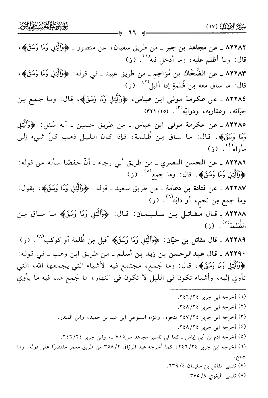 ٨٢٢٨٨ - قال مقاتل بن سليمان: قال: {واللَّيْلِ وما وسَقَ} ما ساق مِن الظُّلمة (¬٧). (ز)