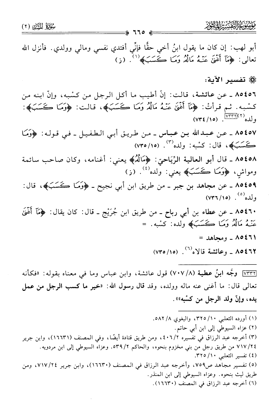 [٧٣٣٢] وجَّه ابنُ عطية (٨/ ٧٠٧) قول عائشة، وابن عباس وما في معناه بقوله: «فكأنه تعالى قال: ما أغنى عنه ماله وولده، وقد قال رسول الله: «خير ما كسب الرجل من عمل يده، وإنّ ولد الرجل من كسْبه»».