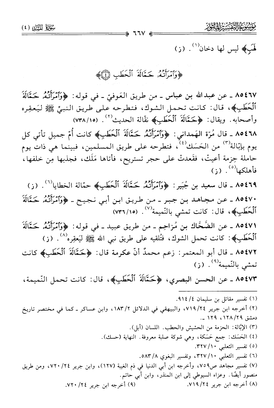 ٨٥٤٧٢ - قال أبو المعتمر: زعم محمدٌ أنّ عكرمة قال: {حَمّالَةَ الحَطَبِ} كانت تمشي بالنّميمة (¬٩). (ز)