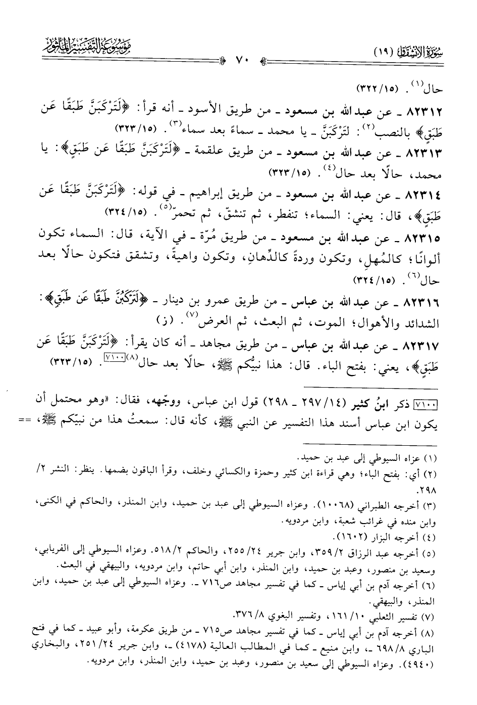 ٨٢٣١٢ - عن عبد الله بن مسعود -من طريق الأسود- أنه قرأ: «لَتَرْكَبَنَّ طَبَقًا عَن طَبَقٍ» بالنصب (¬٢): لتَرْكَبَنَّ -يا محمد- سماءً بعد سماء (¬٣). (١٥/ ٣٢٣)