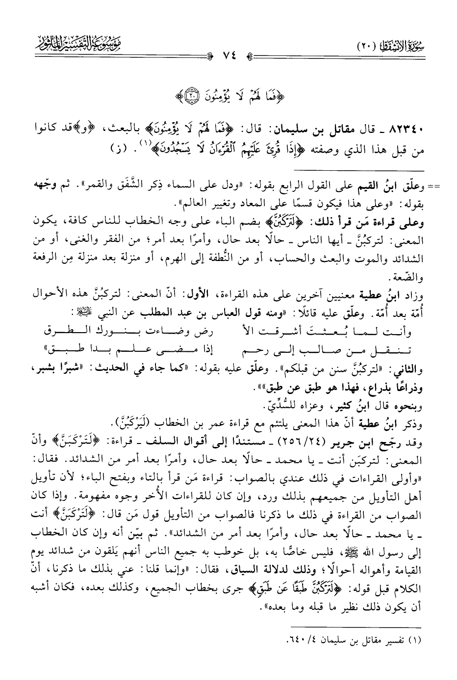 ٨٢٣٤٠ - قال مقاتل بن سليمان: قال: {فَما لَهُمْ لا يُؤْمِنُونَ} بالبعث، {و} قد كانوا من قبل هذا الذي وصفته {إذا قُرِئَ عَلَيْهِمُ القُرْآنُ لا يَسْجُدُونَ} (¬١). (ز)