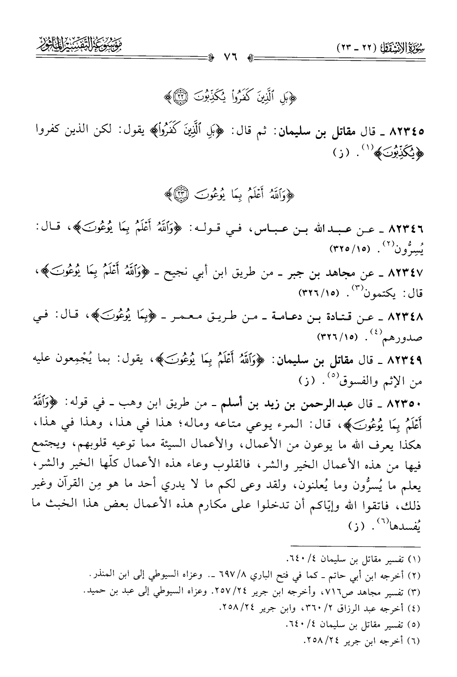 ٨٢٣٤٩ - قال مقاتل بن سليمان: {واللَّهُ أعْلَمُ بِما يُوعُونَ}، يقول: بما يُجْمِعون عليه من الإثم والفسوق (¬٥). (ز)