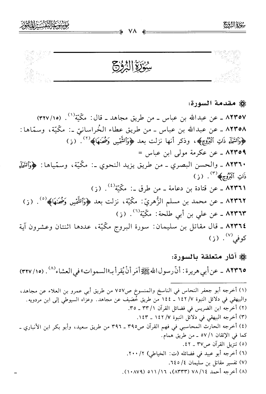 ٨٢٣٥٨ - عن عبد الله بن عباس -من طريق عطاء الخُراسانيّ-: مكّيّة، وسمّاها: {والسَّماءِ ذاتِ البُرُوجِ}، وذكر أنها نزلت بعد {والشَّمْسِ وضُحاها} (¬٢). (ز)