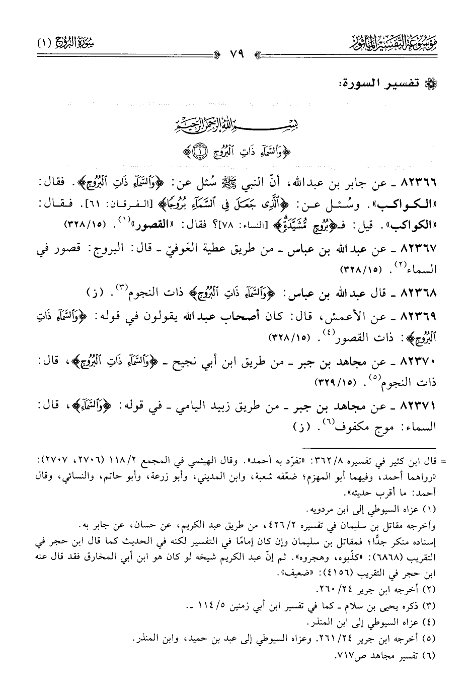 ٨٢٣٦٨ - قال عبد الله بن عباس: {والسَّماءِ ذاتِ البُرُوجِ} ذات النجوم (¬٣). (ز)