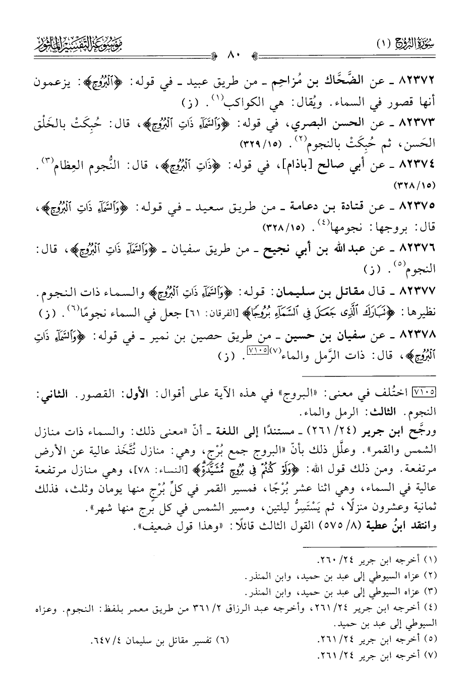 ٨٢٣٧٤ - عن أبي صالح [باذام]، في قوله: {ذاتِ البُرُوجِ}، قال: النُّجوم العِظام (¬٣). (١٥/ ٣٢٨)