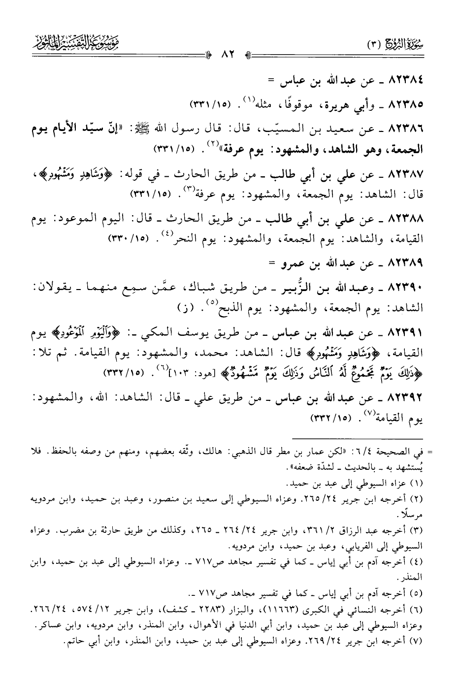 ٨٢٣٩٠ - وعبد الله بن الزُّبير -من طريق شباك، عمَّن سمِع منهما- يقولان: الشاهد: يوم الجمعة، والمشهود: يوم الذبح (¬٥). (ز)