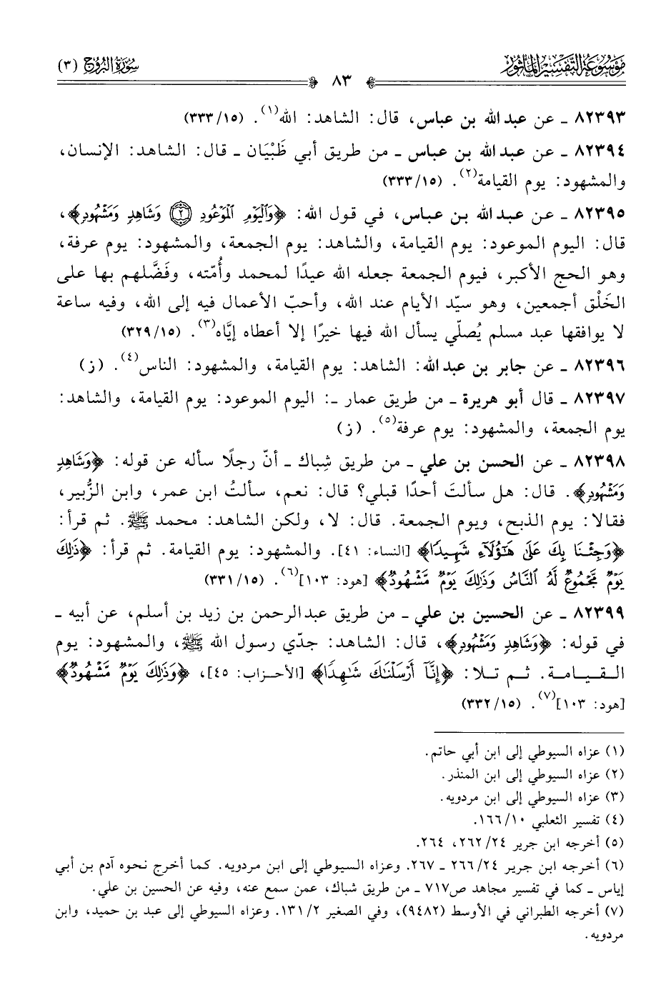 ٨٢٣٩٦ - عن جابر بن عبد الله: الشاهد: يوم القيامة، والمشهود: الناس (¬٤). (ز)
