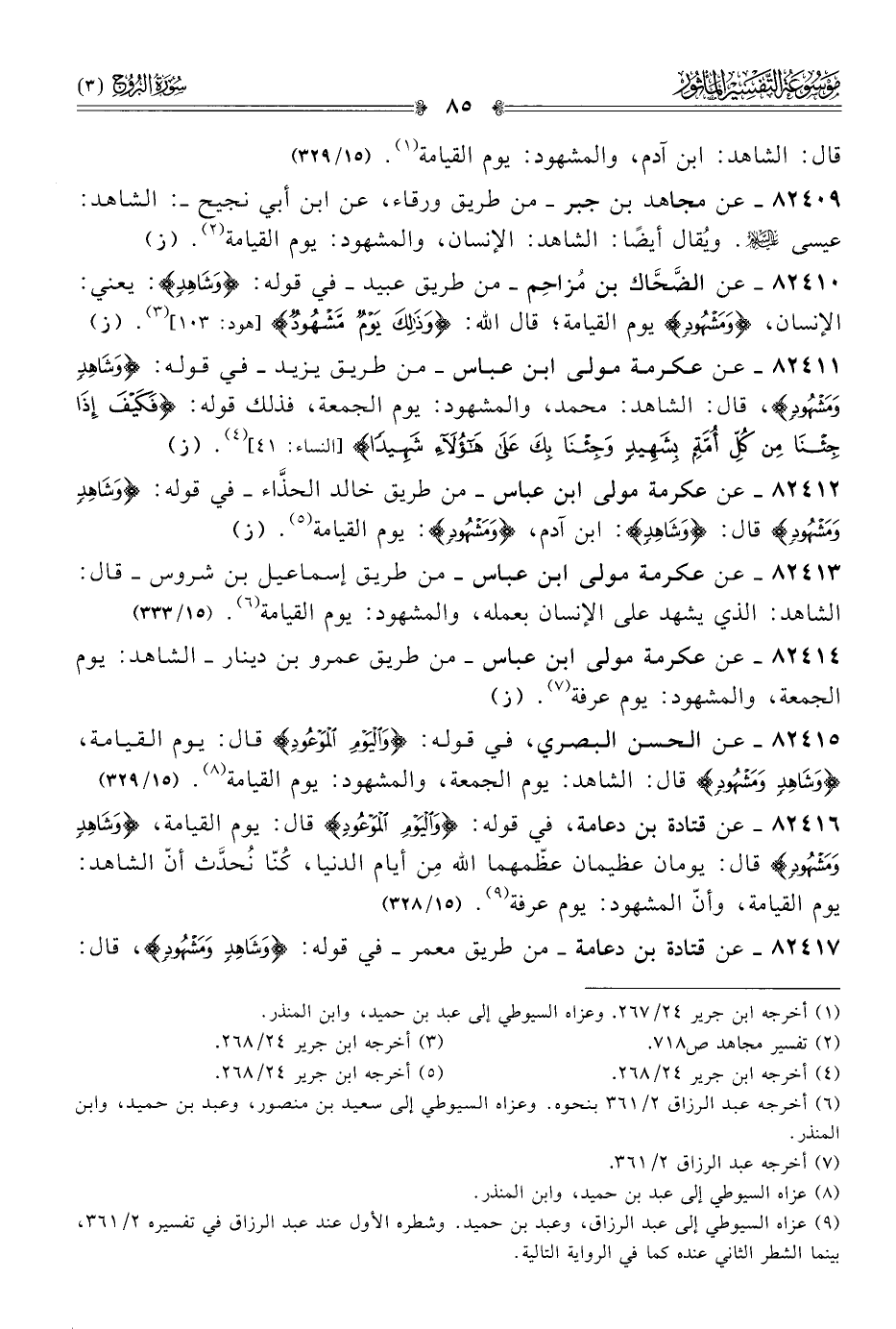 ٨٢٤١٦ - عن قتادة بن دعامة، في قوله: {واليَوْمِ المَوْعُودِ} قال: يوم القيامة، {وشاهِدٍ ومَشْهُودٍ} قال: يومان عظيمان عظّمهما الله مِن أيام الدنيا، كُنّا نُحدَّث أنّ الشاهد: يوم القيامة، وأنّ المشهود: يوم عرفة (¬٩). (١٥/ ٣٢٨)
